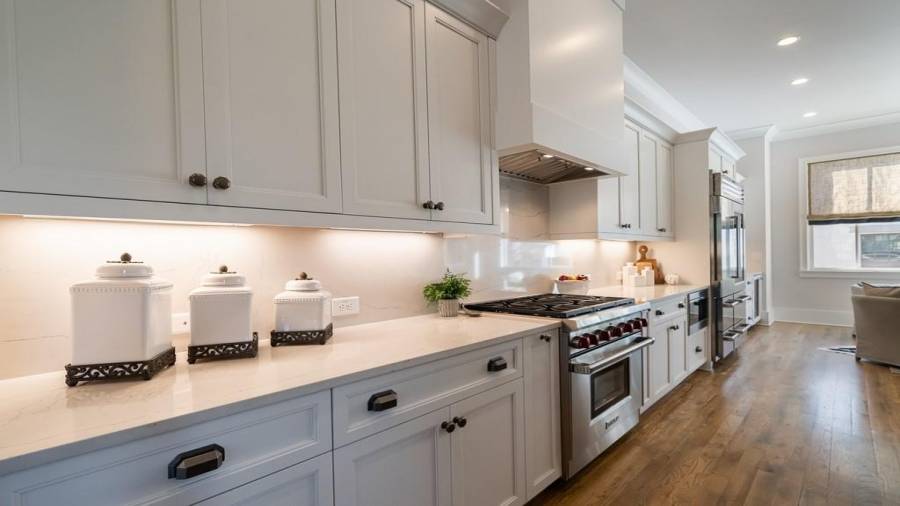 : Cabinets White, Pantry Walk-in, Kitchen Island, View To Family Room, Stone Counters, Solid Surface Counters