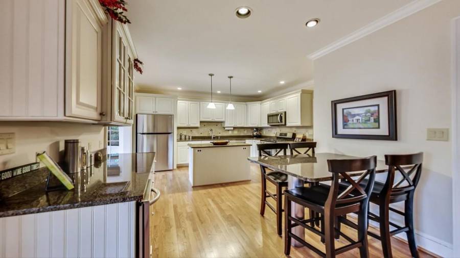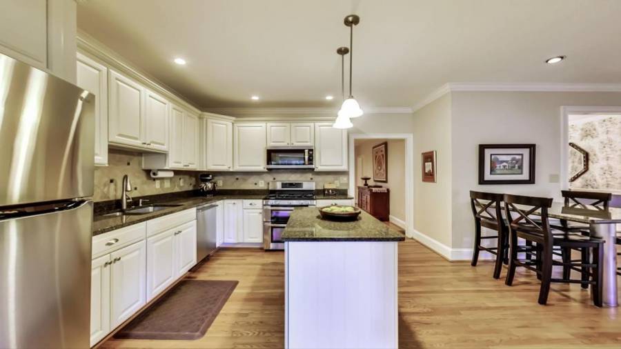 : Breakfast Bar, Eat-in Kitchen, Cabinets White, Keeping Room, Kitchen Island, View To Family Room, Stone Counters