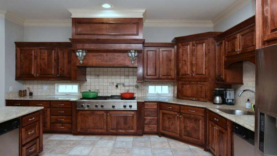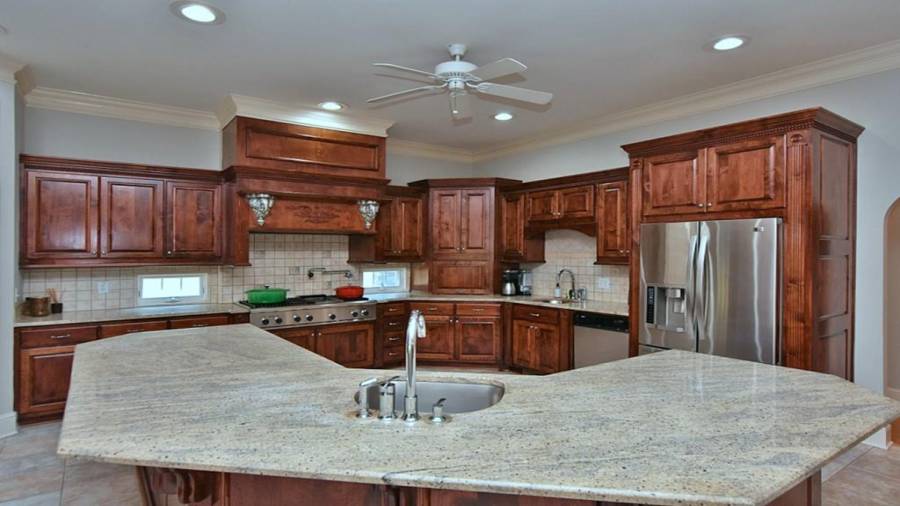 : Cabinets Stain, Eat-in Kitchen, Pantry Walk-in, Kitchen Island, View To Family Room, Stone Counters