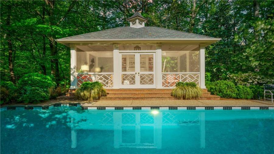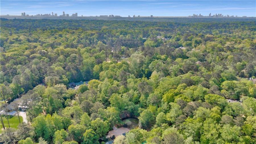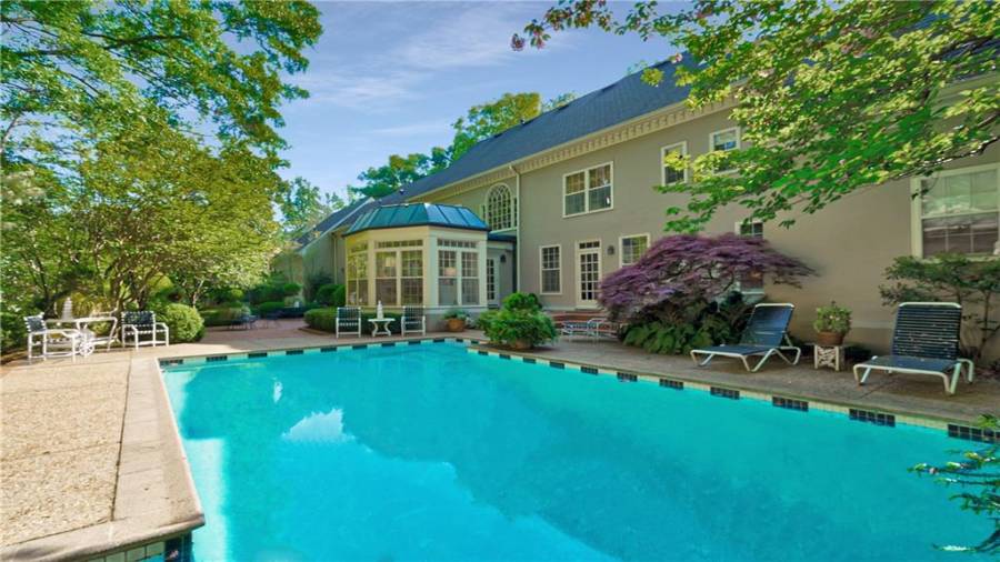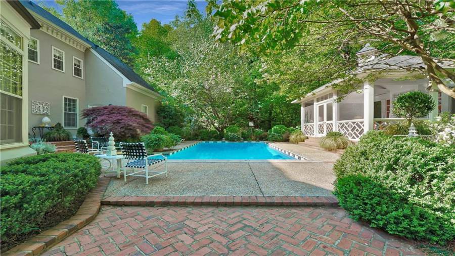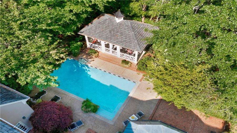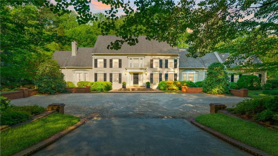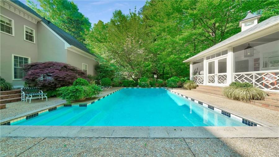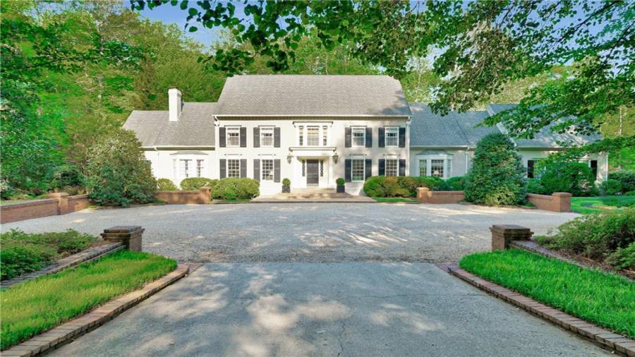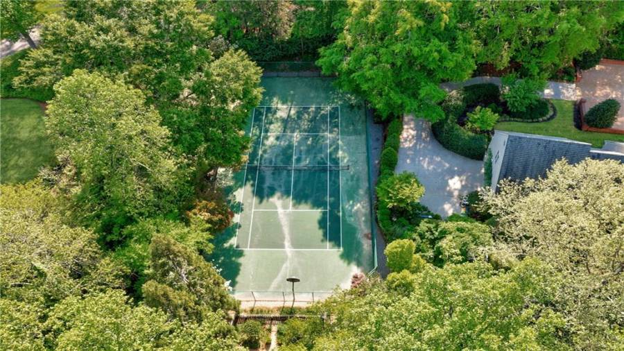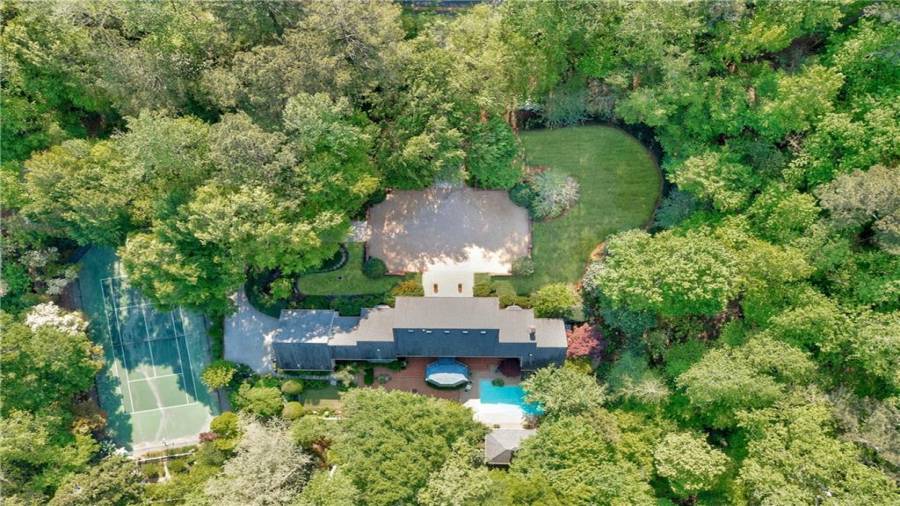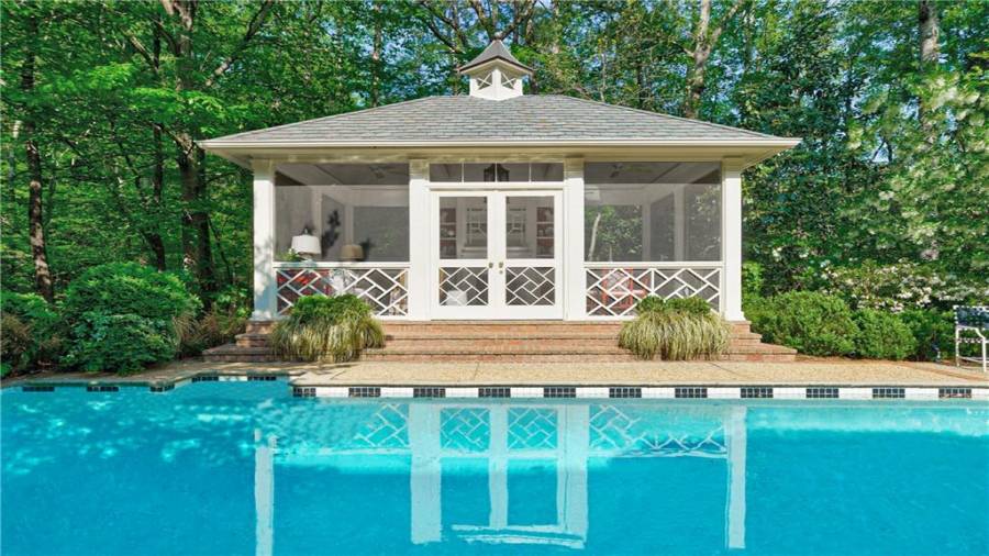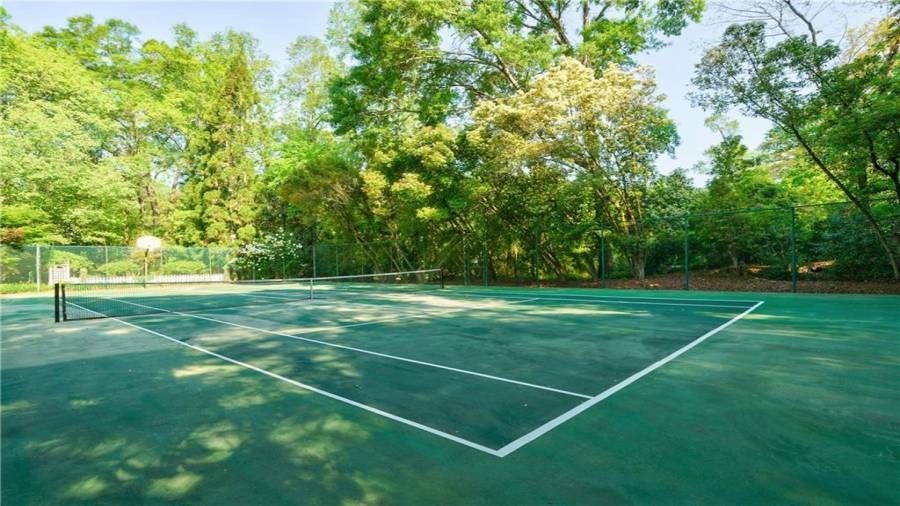 Gorgeous Buckhead estate designed by Norman Askins atop a 2.2 acre private lot backing to Chattahoochee National Forest, and seconds to Whitewater Creek Park trails. Exquisite grounds feature a tennis court, winding trails, pristine landscape and heated gunite pool. The custom pool house is screened, includes a fireplace, bookcases, refrigeration and offers living and dining spaces with gorgeous views. Welcoming marble foyer with a grand staircase is open to the formal fireside living room & banquet sized dining room. Renovated kitchen with state-of-the art