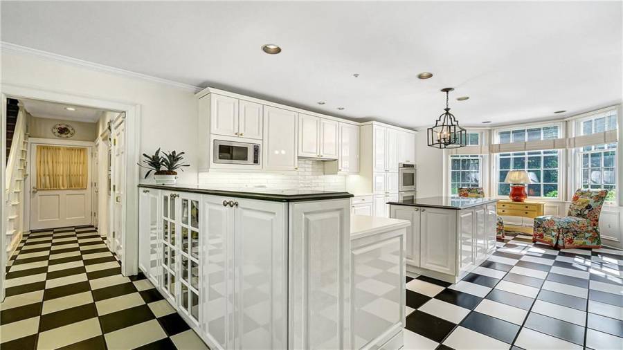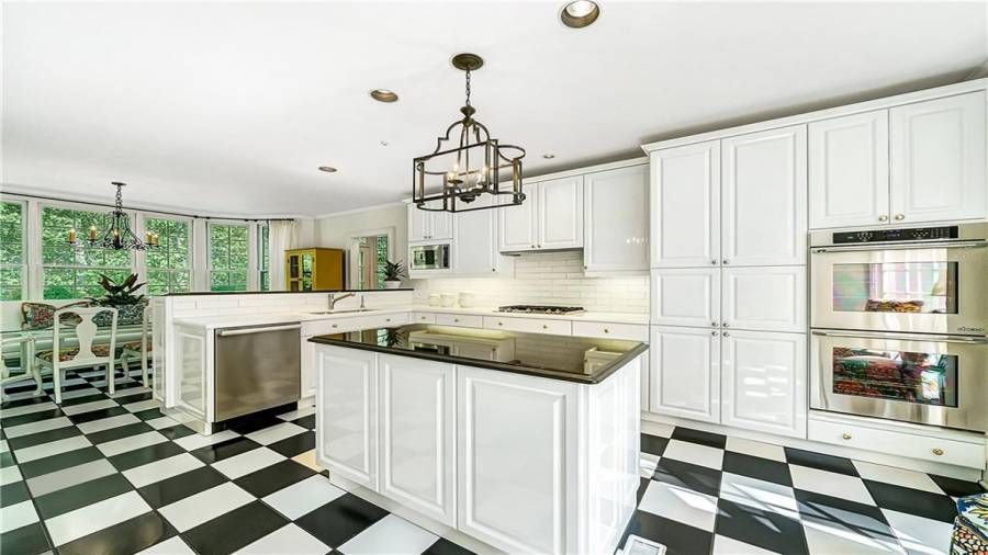 : Breakfast Room, Cabinets White, Kitchen Island, Pantry, View To Family Room, Stone Counters