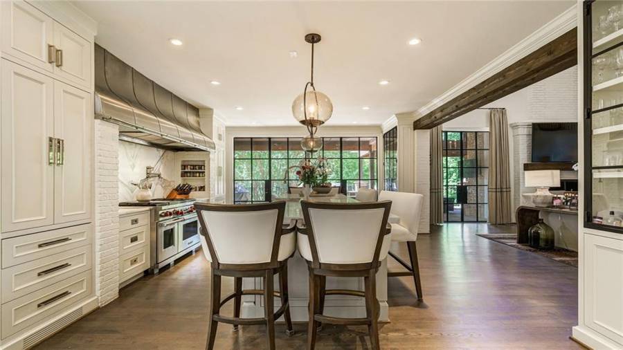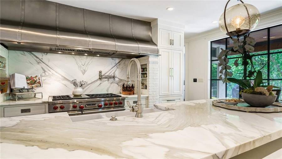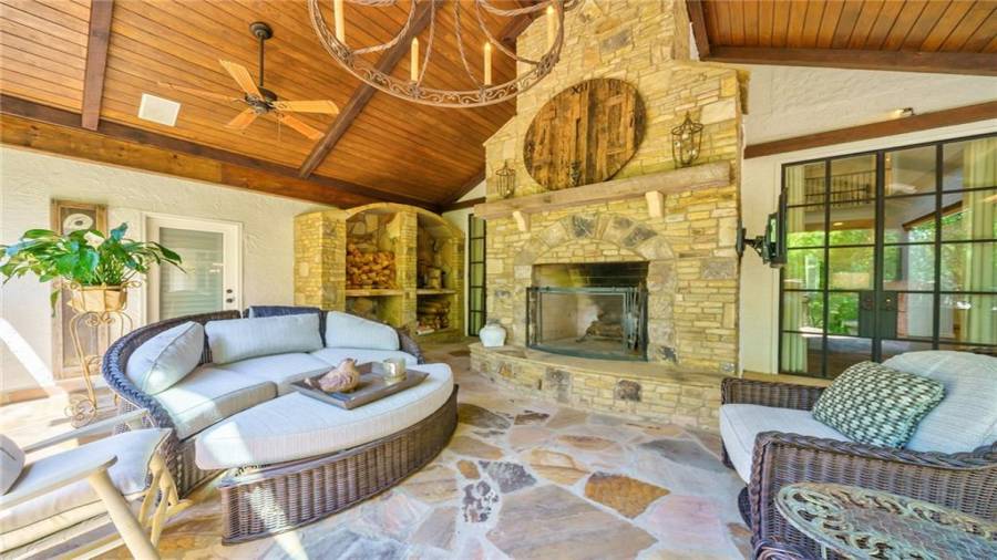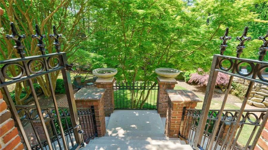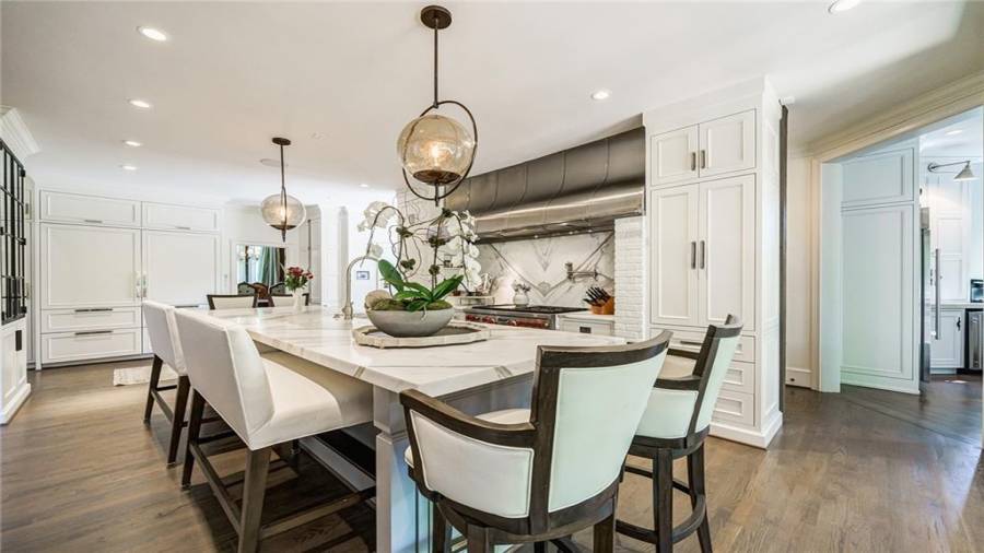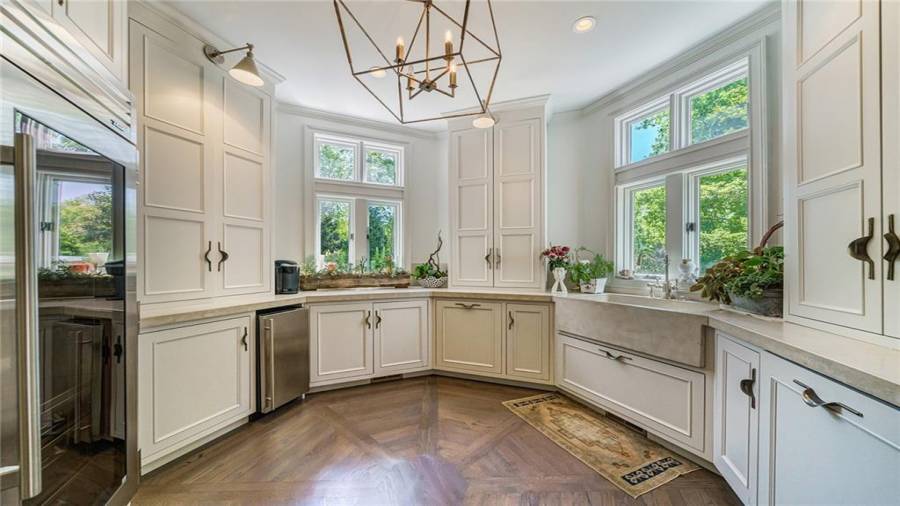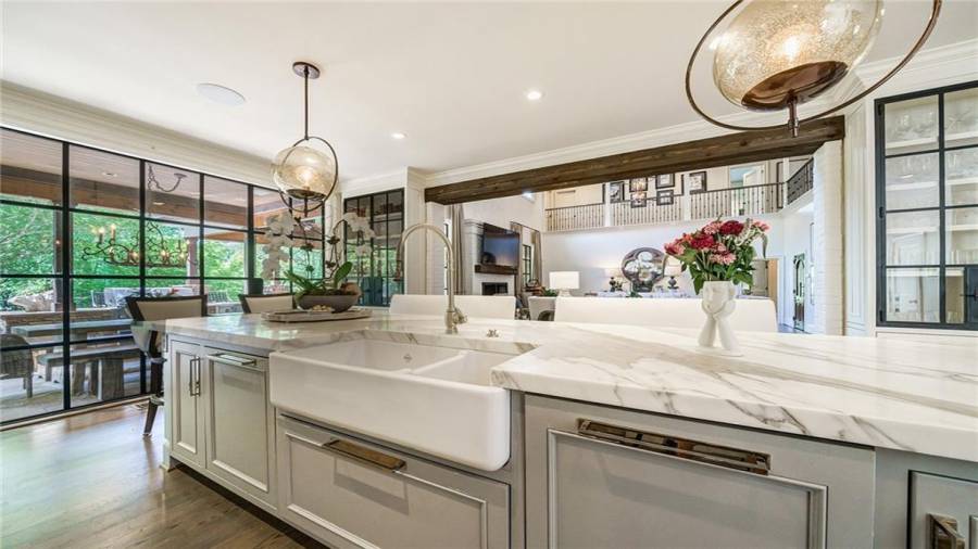 Exceptional Estate on 2 acres, gated with pool and tennis. A graceful family home that has been renovated with the finest materials. The elegant kitchen features an oversized island of calcutta gold marble, custom stainless steel hood, new appliances and cabinetry with special inset hardware and iron details. The breathtaking kitchen flows seamlessly into a fireside family room. New iron windows and doors across the back open to expansive covered loggia with outdoor fireplace, overlooking pool with waterfall and slide. This is a fun home, lots of room to entertain, with