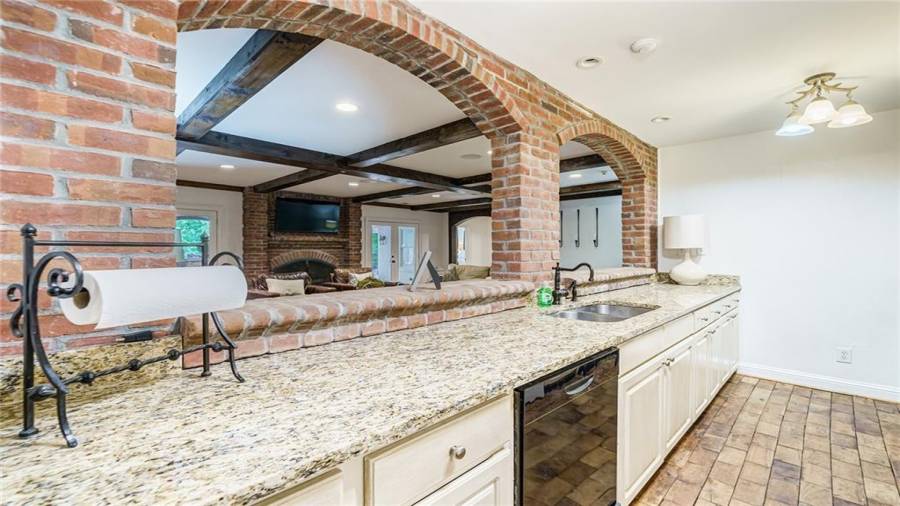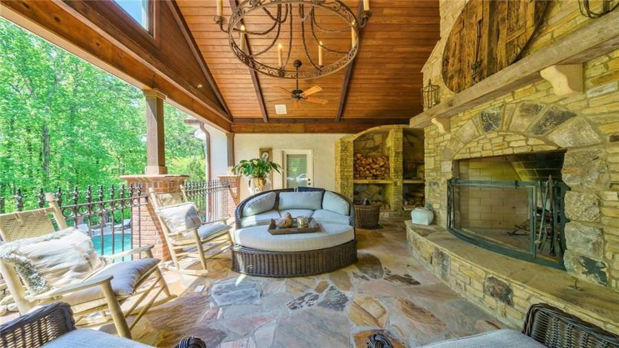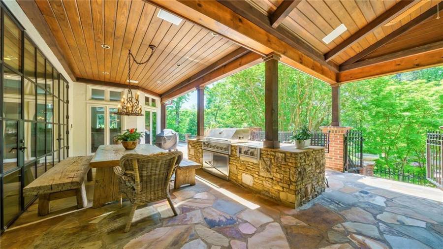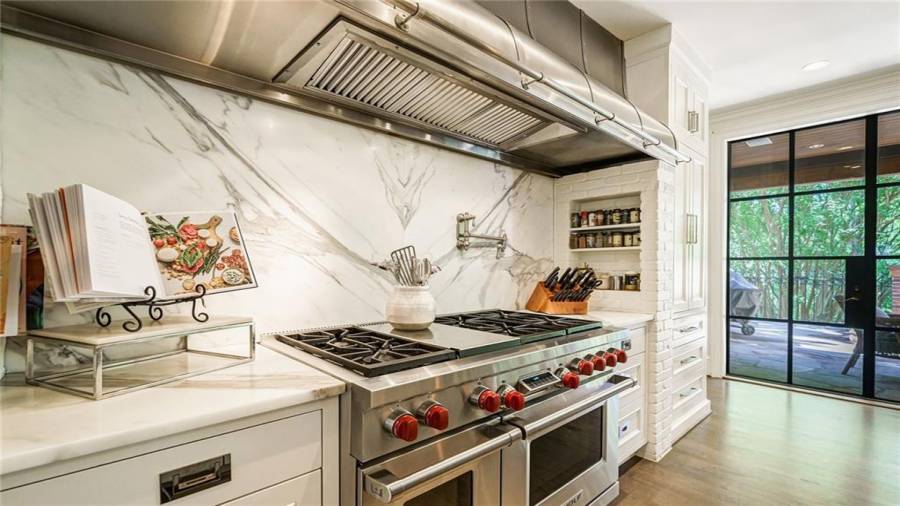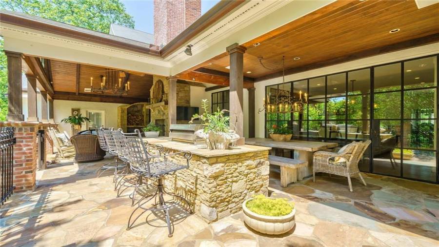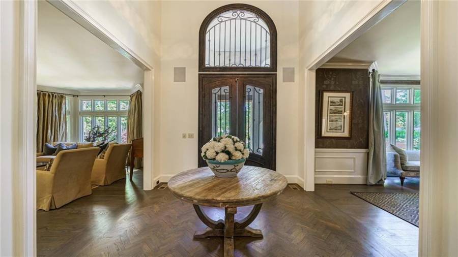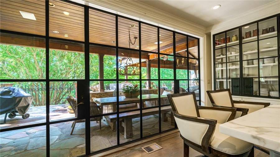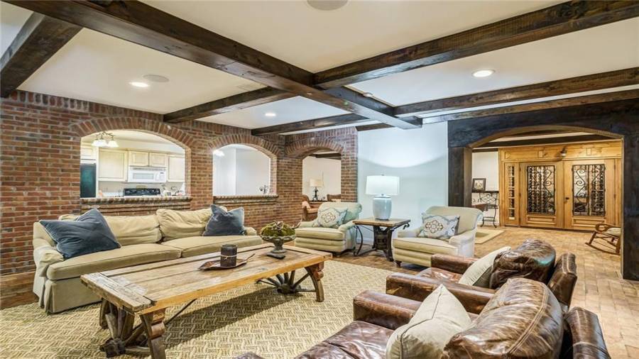 Exceptional Estate on 2 acres, gated with pool and tennis. A graceful family home that has been renovated with the finest materials. The elegant kitchen features an oversized island of calcutta gold marble, custom stainless steel hood, new appliances and cabinetry with special inset hardware and iron details. The breathtaking kitchen flows seamlessly into a fireside family room. New iron windows and doors across the back open to expansive covered loggia with outdoor fireplace, overlooking pool with waterfall and slide. This is a fun home, lots of room to entertain, with