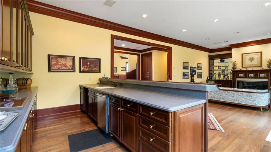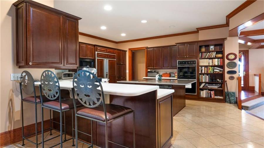 : Breakfast Bar, Cabinets Stain, Pantry Walk-in, Kitchen Island, View To Family Room, Solid Surface Counters