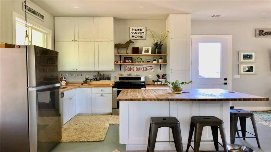 : Eat-in Kitchen, Cabinets White, Kitchen Island, Pantry, View To Family Room, Other Surface Counters