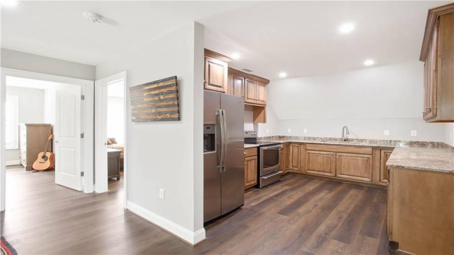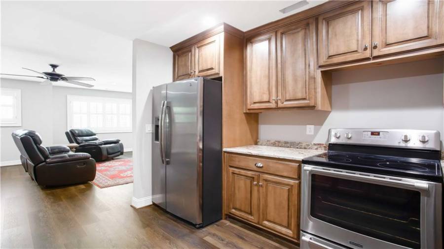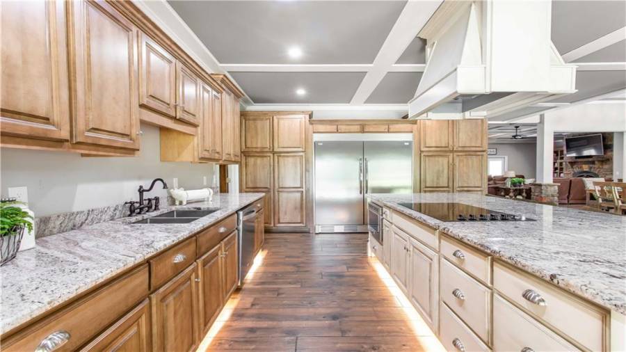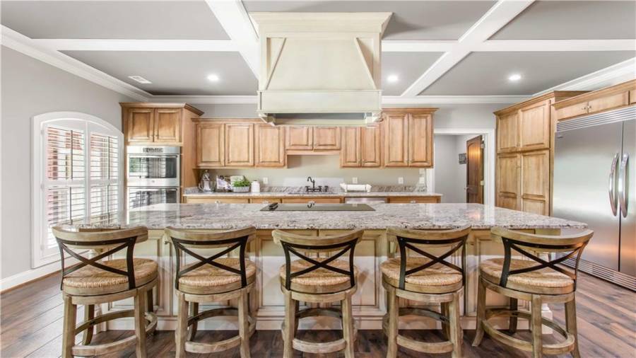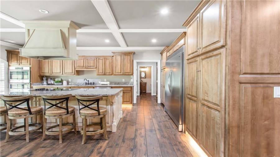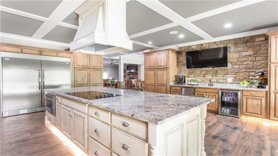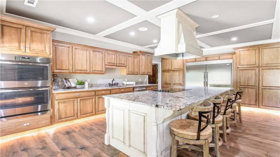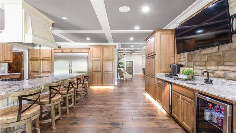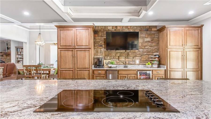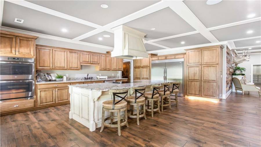 : Breakfast Bar, Cabinets Stain, Eat-in Kitchen, Kitchen Island, Pantry, Second Kitchen, View To Family Room, Stone Counters