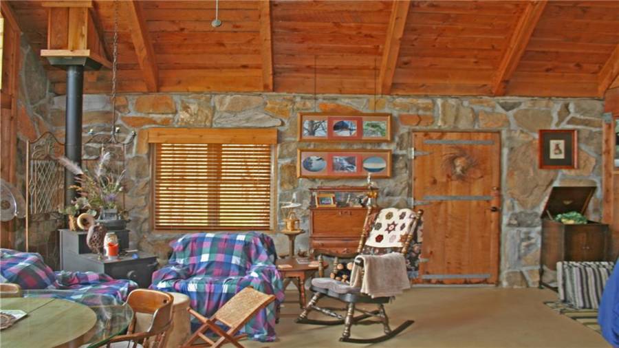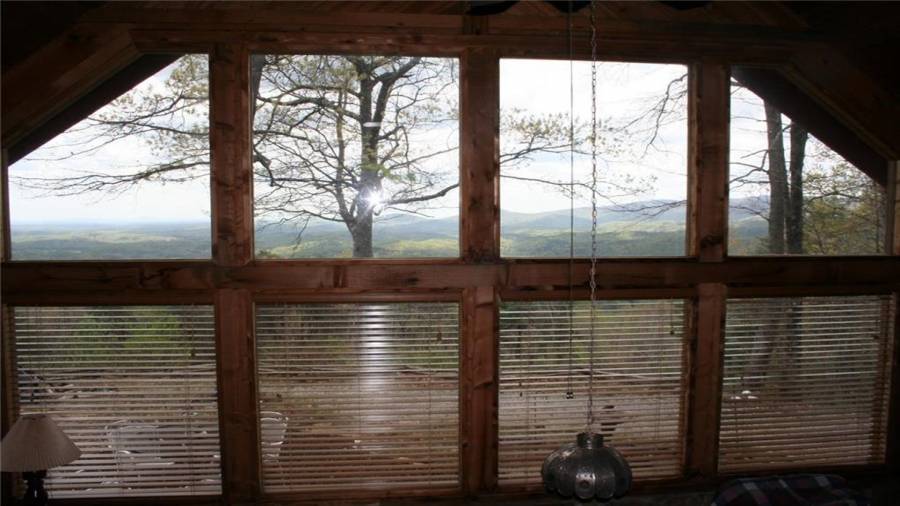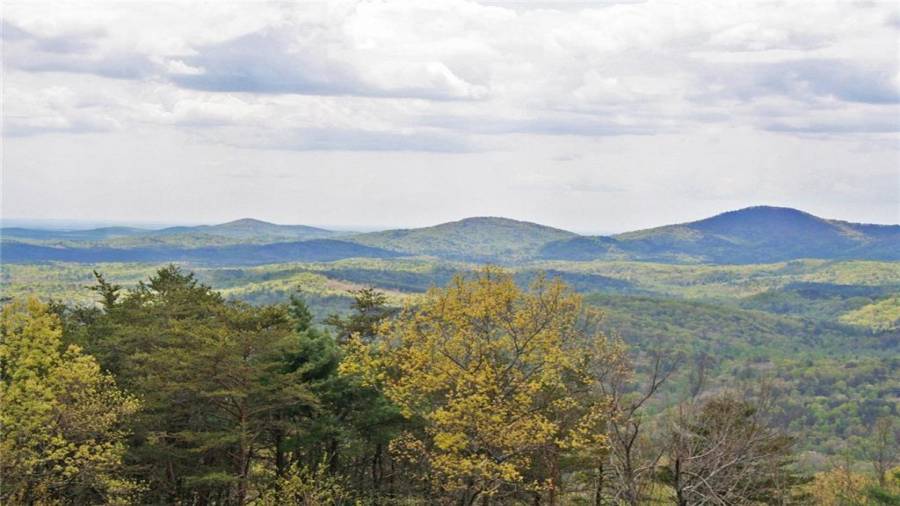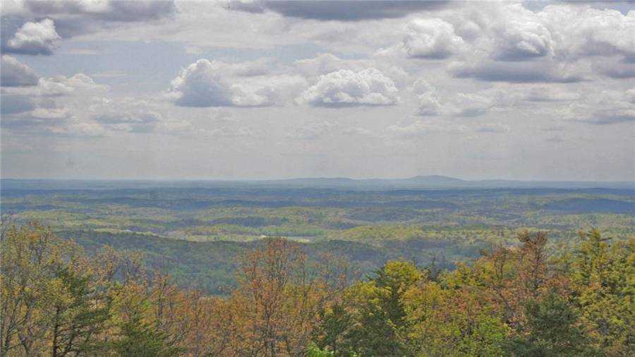 ABOVE IT ALL AT 2440′ elevation lies 32 acres with views of spectacular dimension an a hand-hewn stone/timber cottage (literally a work of art) adjoining lands of the U.S. National Forest. Seen on the far horizon – the buildings of ATL; nearby the crests of Burnt Mtn Range. Trails circle the land; a branch swiftly flows and a waterfall cascades. This rare combination of factors – cooler summers, unparalleled views, a beautiful setting, flowing waters, winsome and warm cottage, open terrain and wooded forestland; all combine to offer a feeling that’s good for the soul.