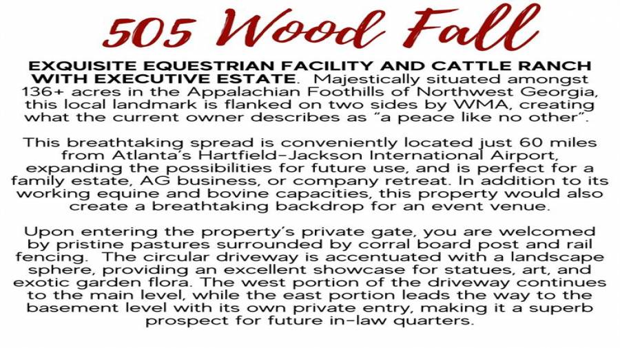EXQUISITE EQUESTRIAN FACILITY AND CATTLE RANCH WITH EXECUTIVE ESTATE. Majestically situated amongst 136+ acres in the Appalachian Foothills of Northwest Georgia, this local landmark is flanked on two sides by WMA, creating what the current owner describes as a peace like no other. This breathtaking spread is conveniently located just 60 miles from Atlanta’s Hartfield-Jackson International Airport, expanding the possibilities for future use, and is perfect for a family estate, AG business, or company retreat. In addition. . . SEE COMPLETE PROPERTY DESCRIPTION IN PHOTOS