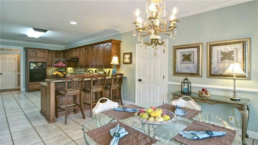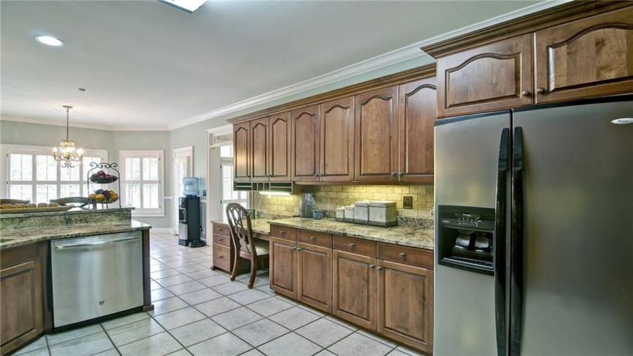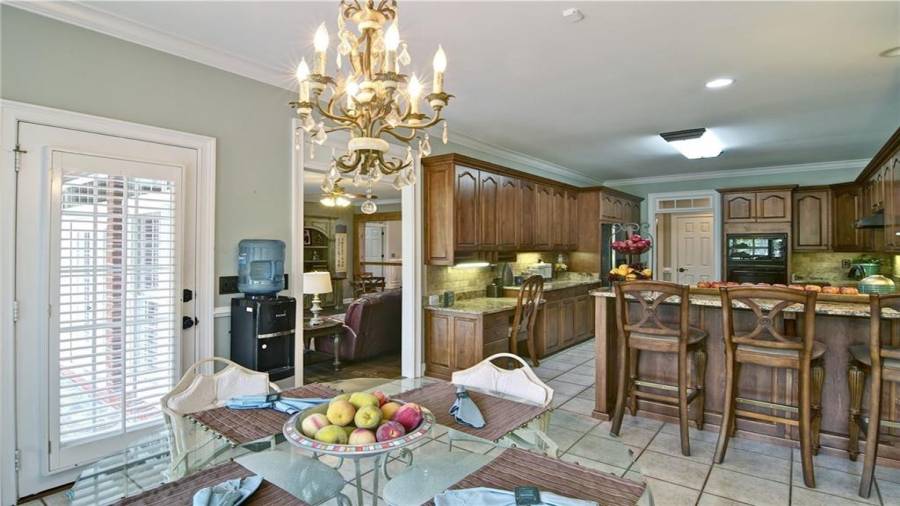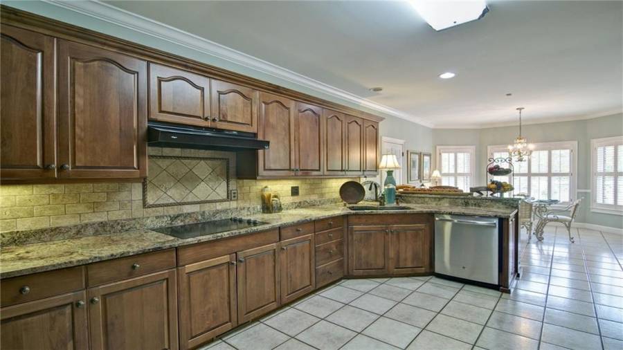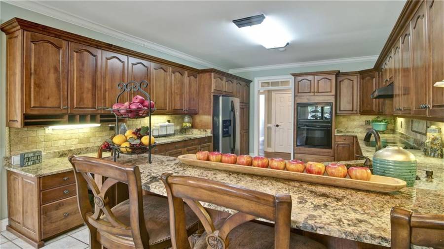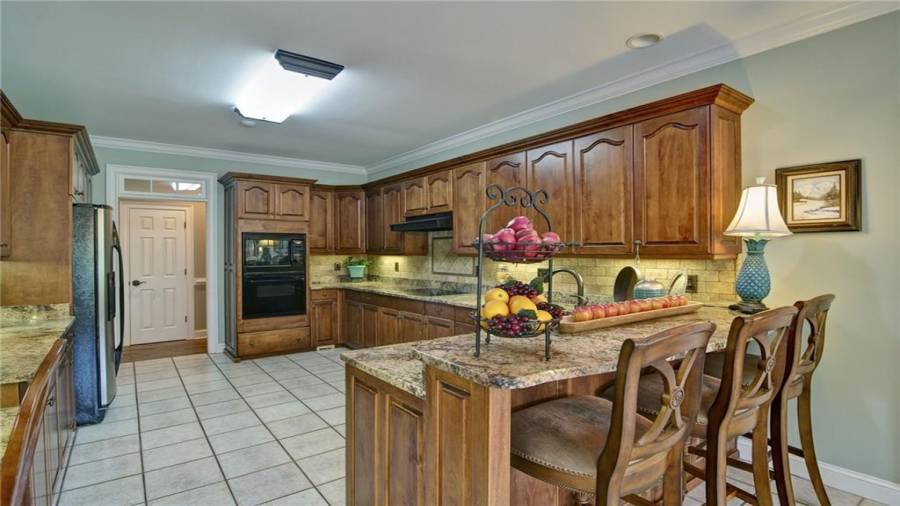 : Cabinets Stain, Eat-in Kitchen, Kitchen Island, Stone Counters, Cabinets Other