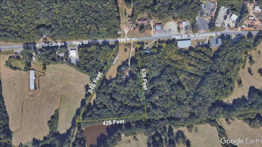 Great opportunity on expanding thoroughfare in a fast growing hwy commercial area. Seller says property MUST Go! Start your business on this 5.072 Acres with total of 190 +/- road frontage on Hwy 20. Georgia has been voted #1 place to start a business for 3 years in a row! This land is flat and easy to develop. Located just 1/2 mile from Cherokee/Forsyth Co. line. Property is zoned agricultural except small section in the front that is zoned commercial. Turn your dream into reality, make an offer now!