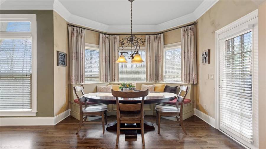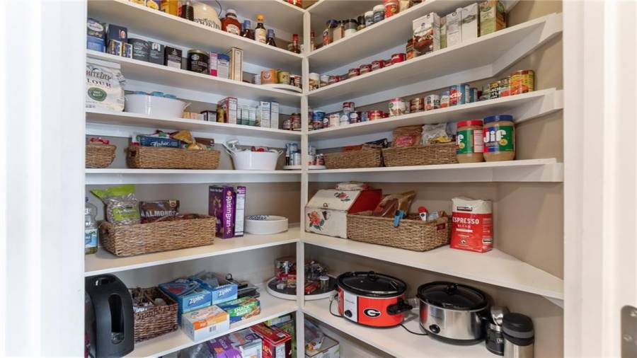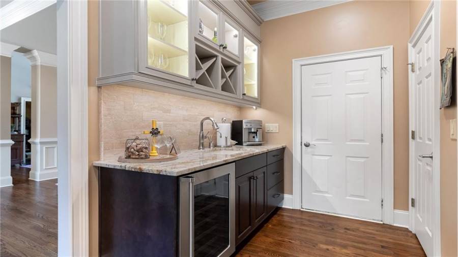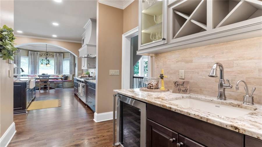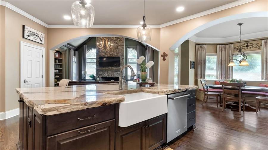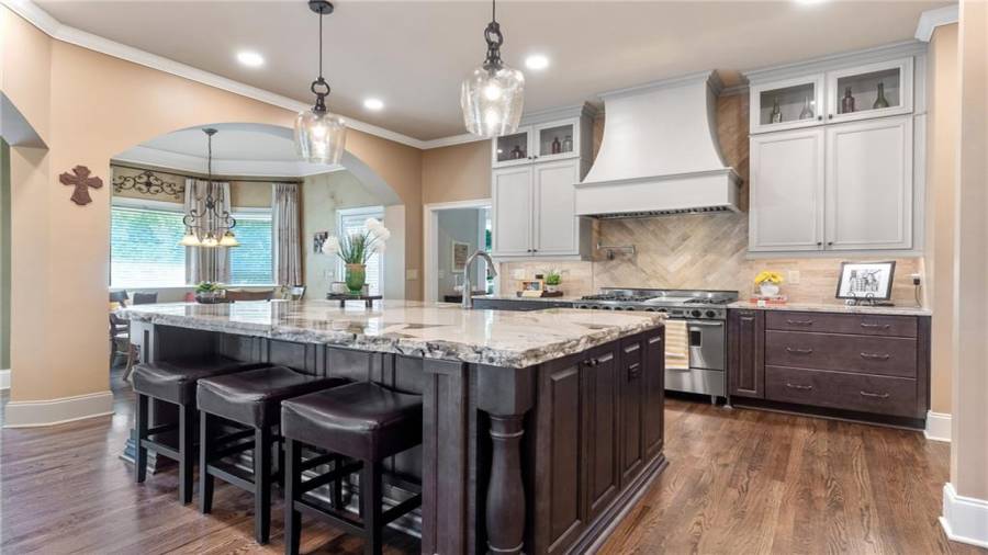 : Cabinets Stain, Breakfast Room, Cabinets White, Pantry Walk-in, Keeping Room, Kitchen Island, View To Family Room, Stone Counters, Wine Rack