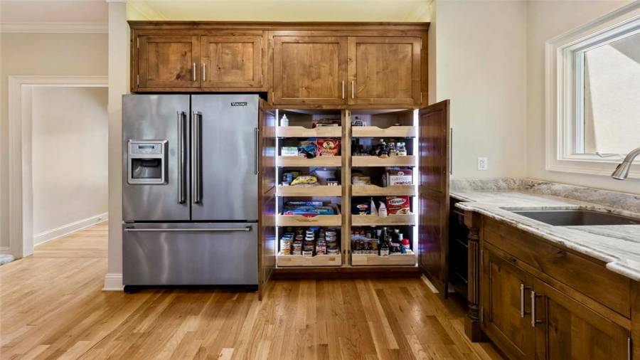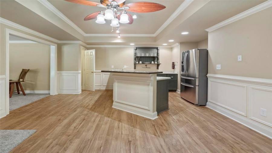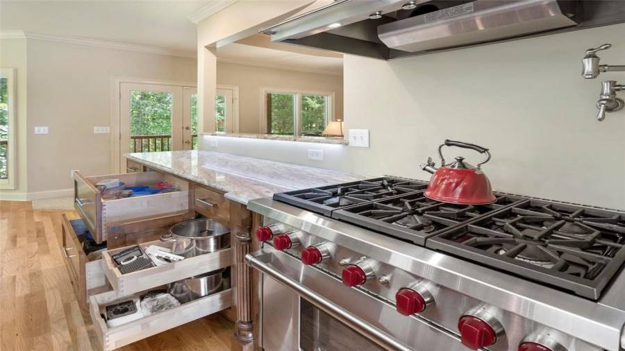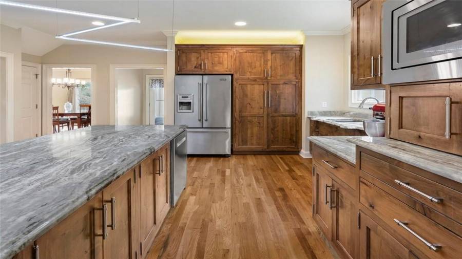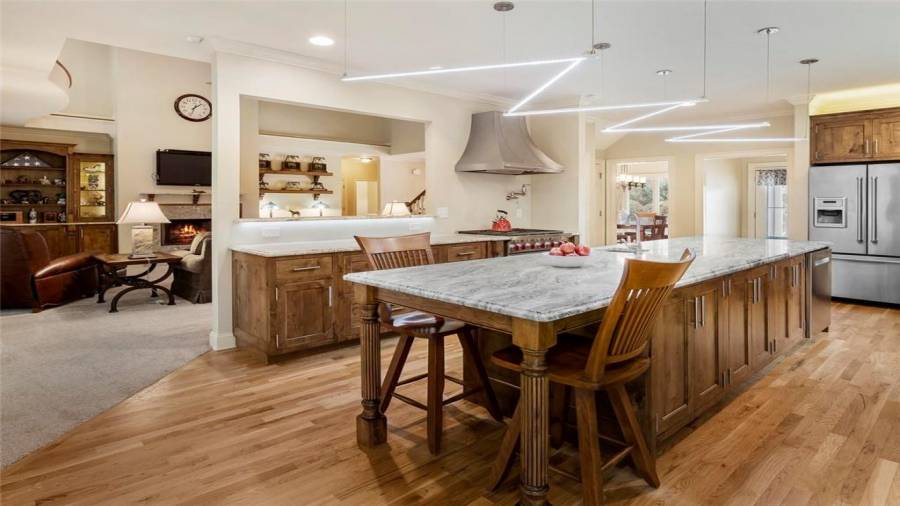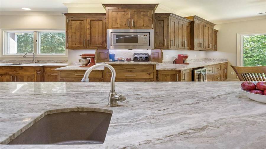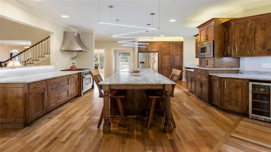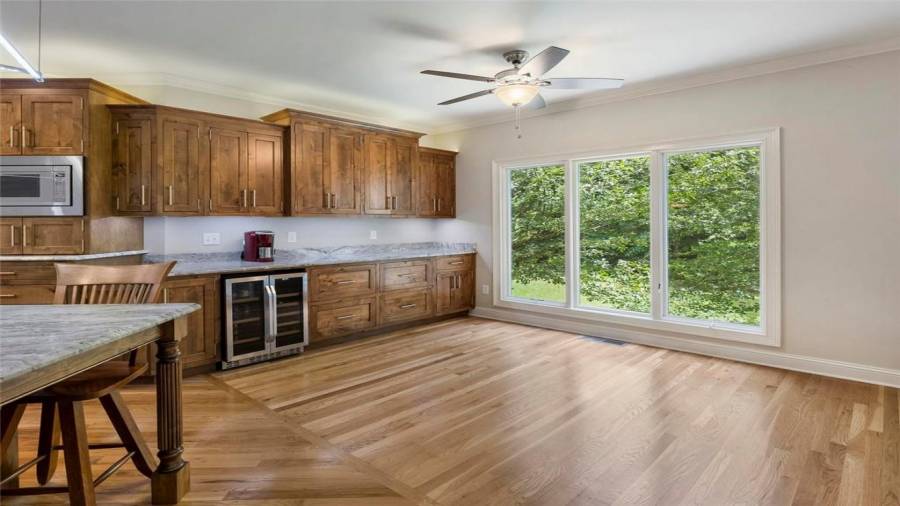 : Breakfast Bar, Eat-in Kitchen, Breakfast Room, Kitchen Island, View To Family Room, Stone Counters, Wine Rack