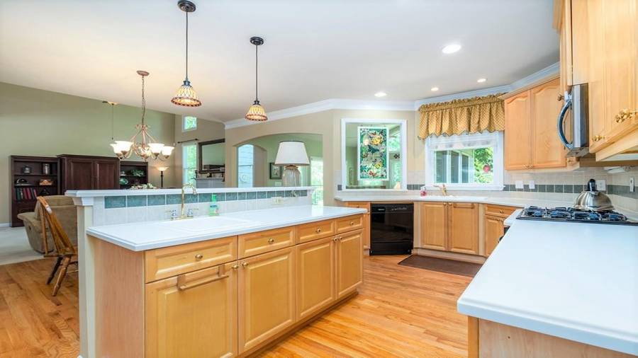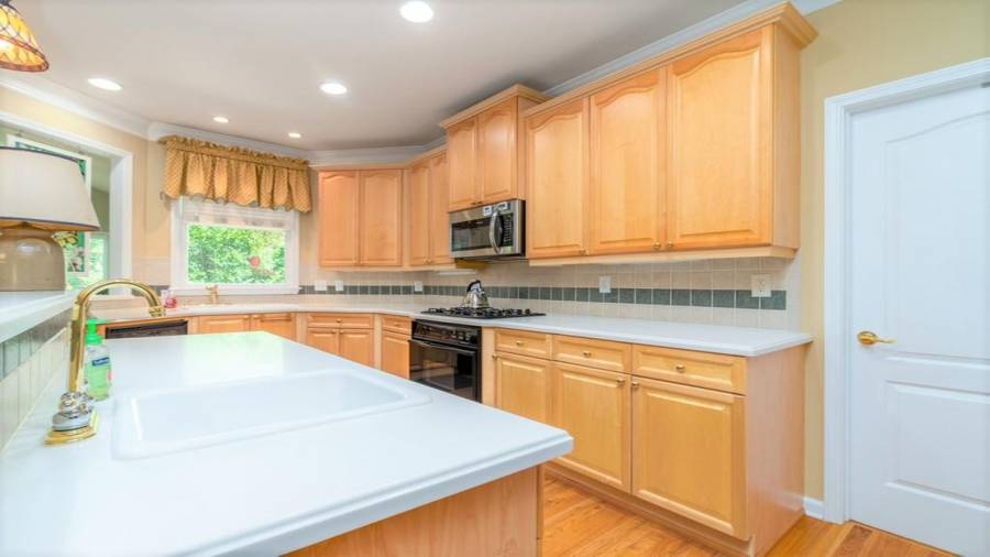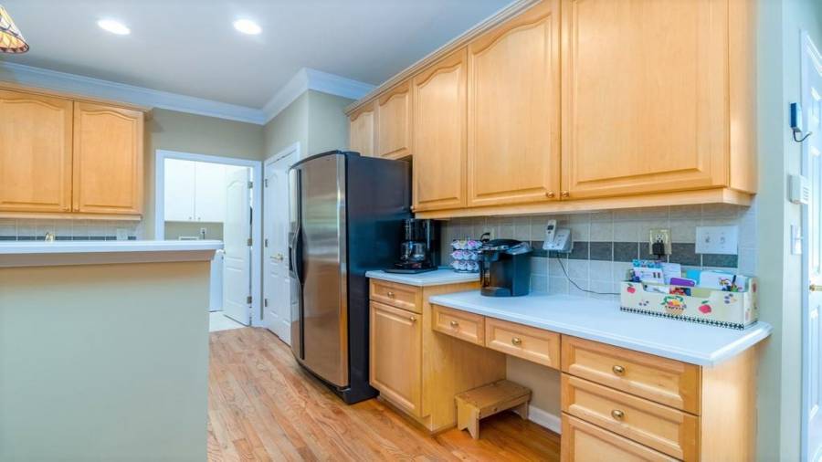 : Breakfast Bar, Cabinets Stain, Eat-in Kitchen, Pantry, View To Family Room, Solid Surface Counters, Other Surface Counters