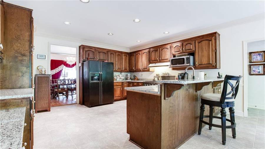 : Breakfast Bar, Cabinets Stain, Breakfast Room, Pantry, View To Family Room, Stone Counters