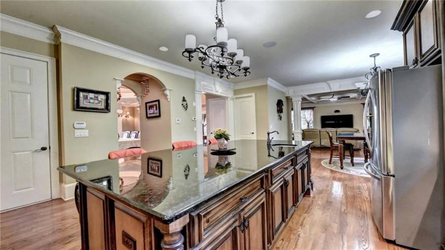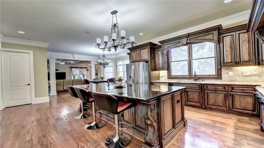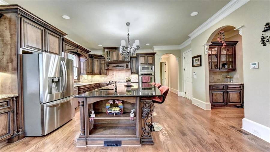 : Cabinets Stain, Eat-in Kitchen, Pantry Walk-in, Kitchen Island, View To Family Room, Stone Counters