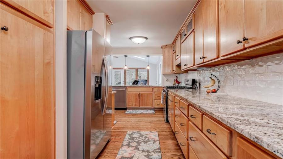 : Breakfast Bar, Cabinets Stain, Breakfast Room, View To Family Room, Stone Counters