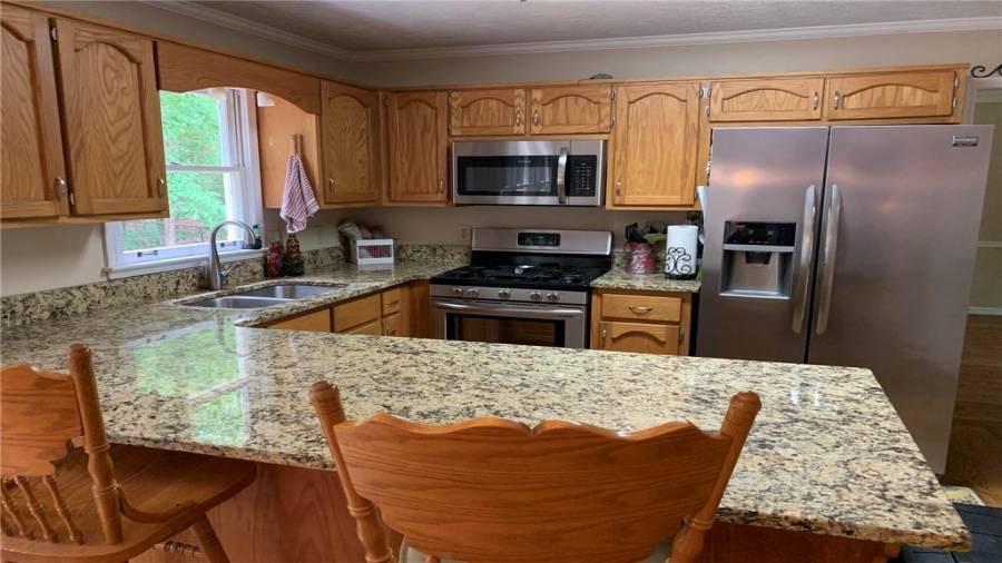 : Breakfast Bar, Cabinets Stain, Pantry, View To Family Room, Stone Counters