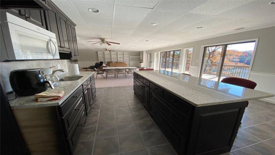 : Eat-in Kitchen, Breakfast Room, Cabinets White, Kitchen Island, View To Family Room, Stone Counters