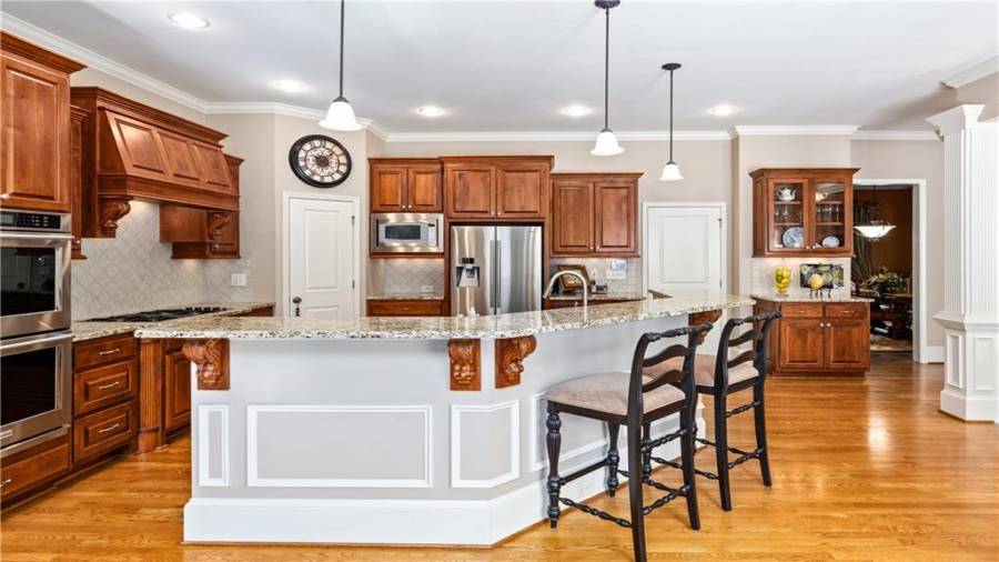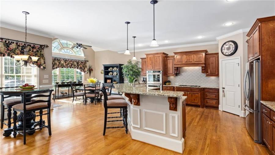 : Breakfast Bar, Cabinets Stain, Breakfast Room, Pantry Walk-in, Kitchen Island, View To Family Room, Stone Counters