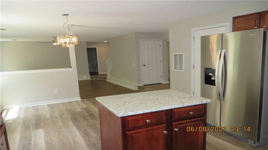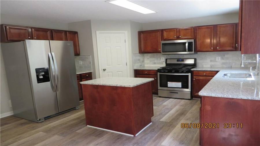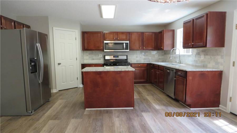 : Cabinets Stain, Eat-in Kitchen, Pantry Walk-in, Kitchen Island, Pantry, Stone Counters, Solid Surface Counters