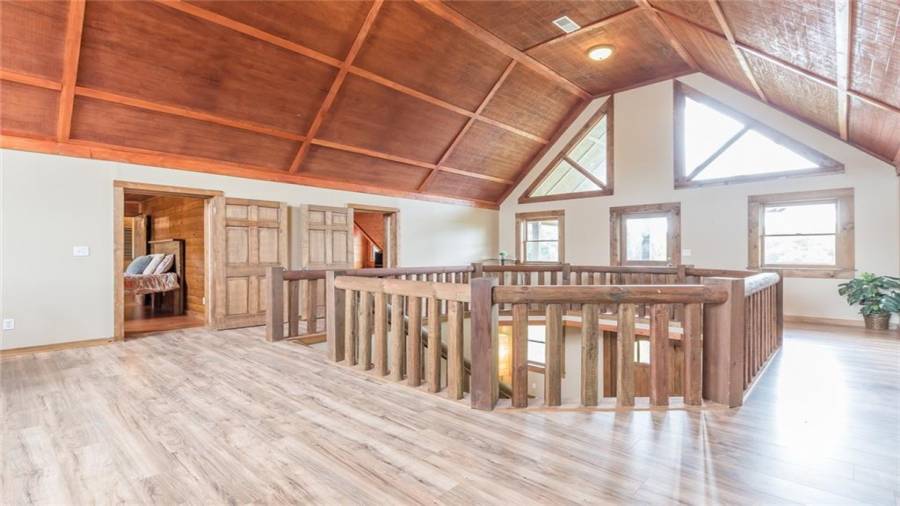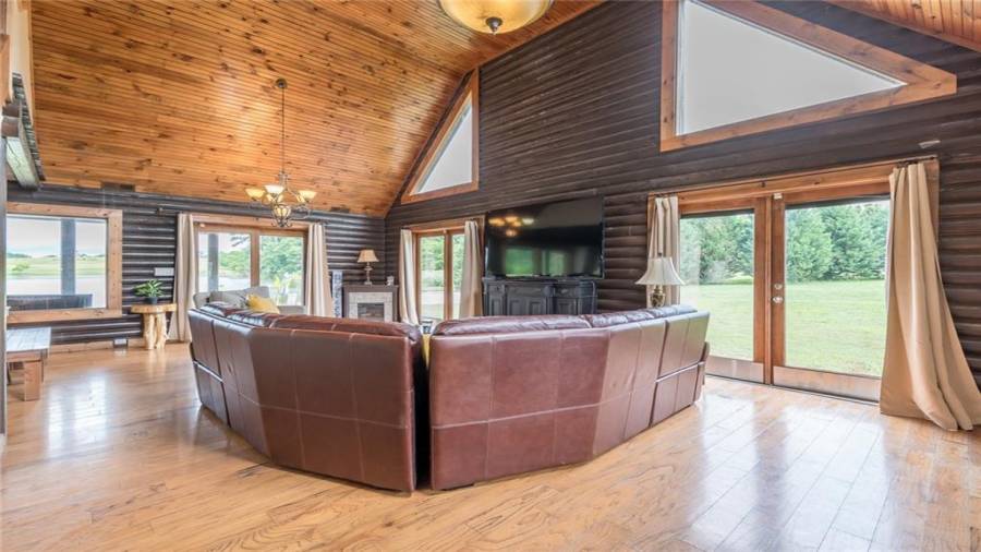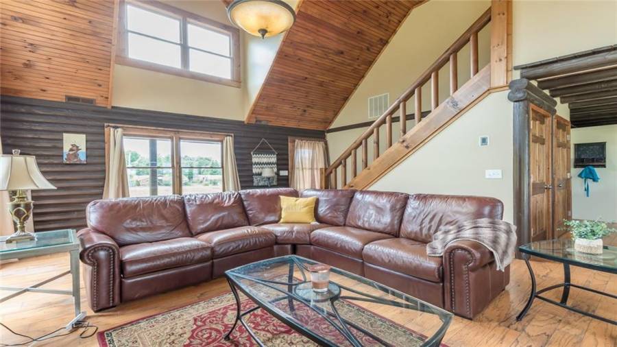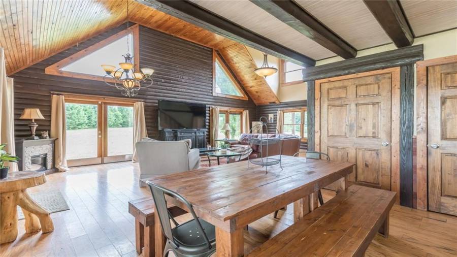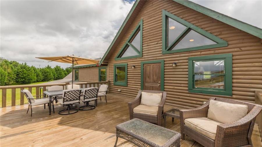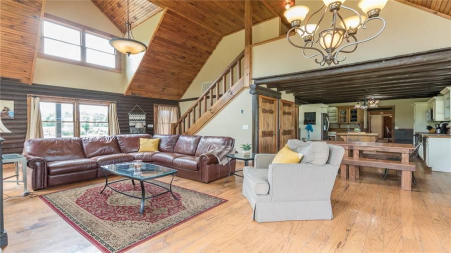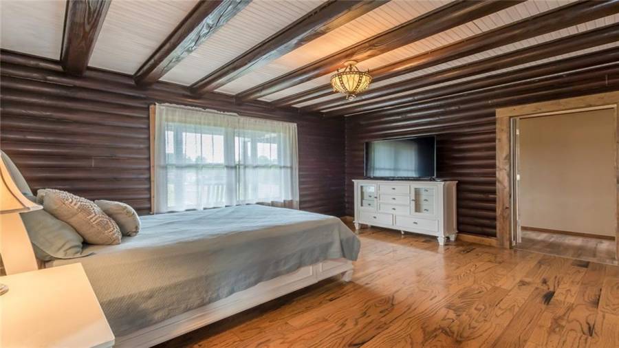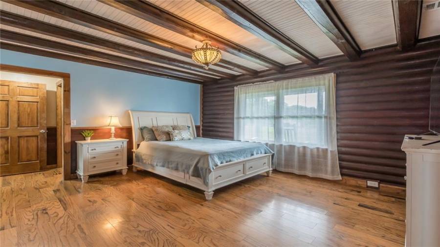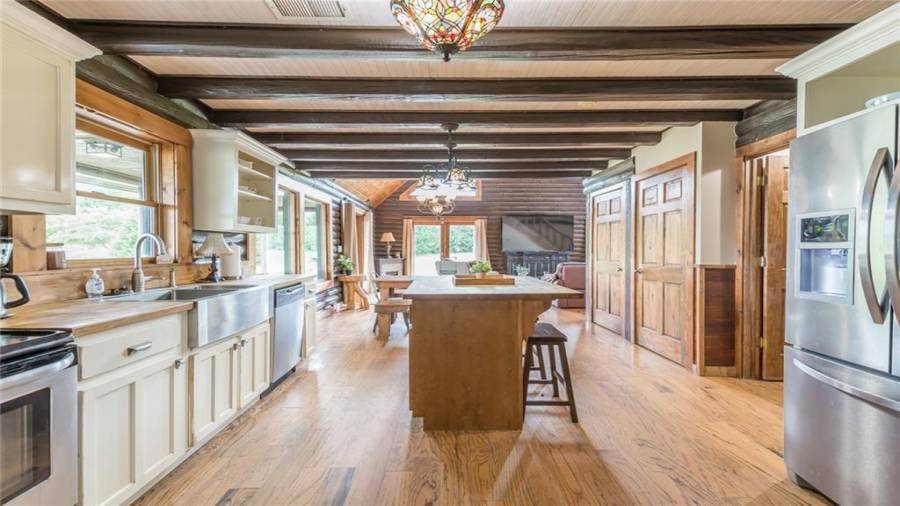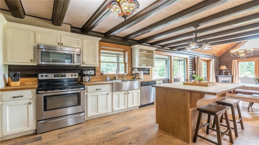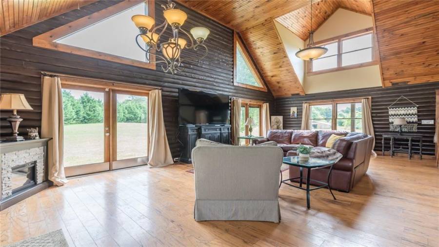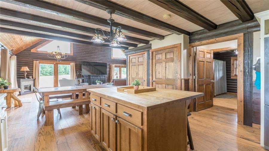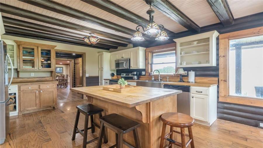 Indulge in gathering around a fire or relaxing in your jacuzzi under a blanket of stars. At the heart of this stunning log home is a beautiful country-chic kitchen with custom cabinets, stainless steel appliances, butcher’s block countertops, and a walk-in pantry. Enjoy gathering in the family room or the two-story great room, both with 20+ ft. ceilings and an abundance of natural light from the custom-made windows.