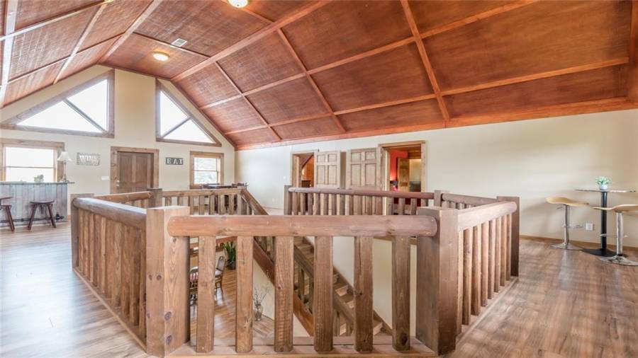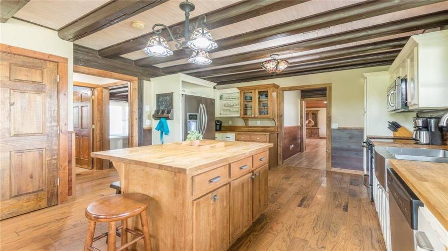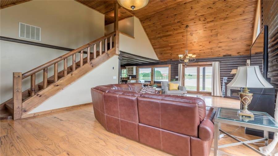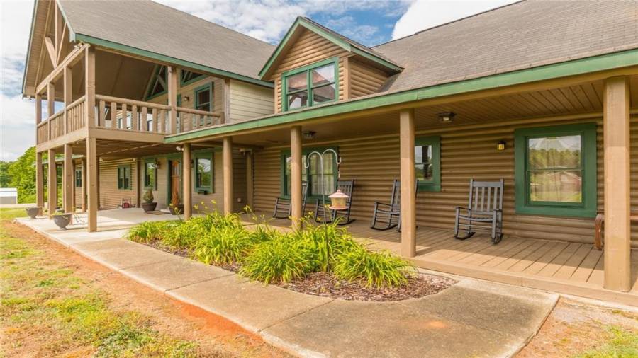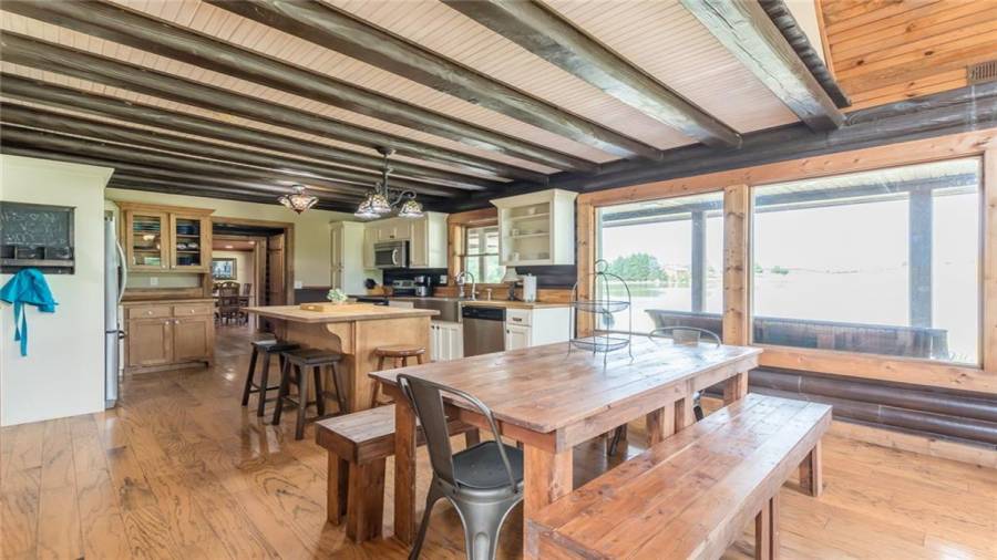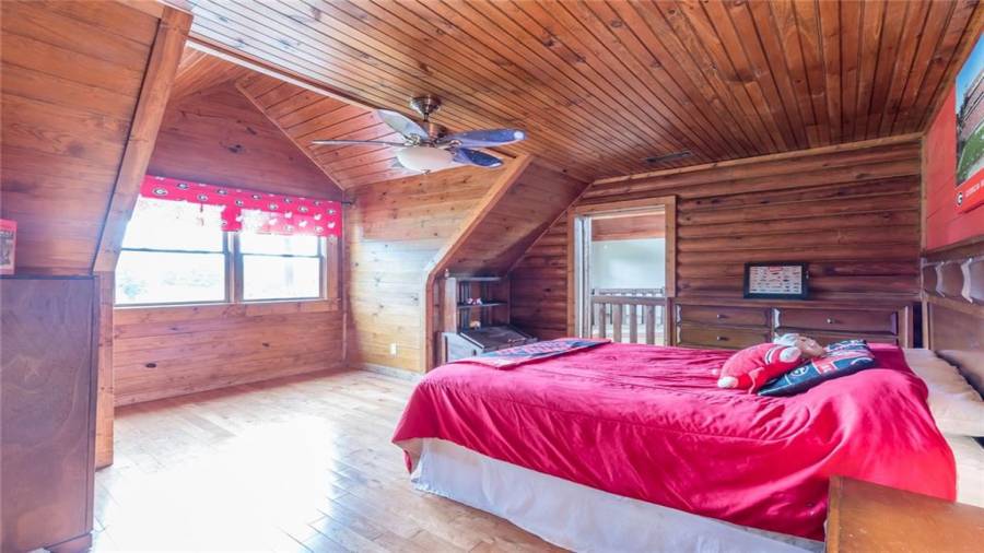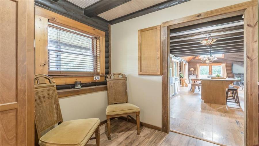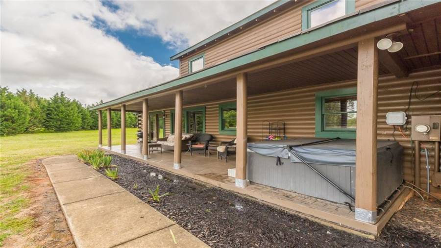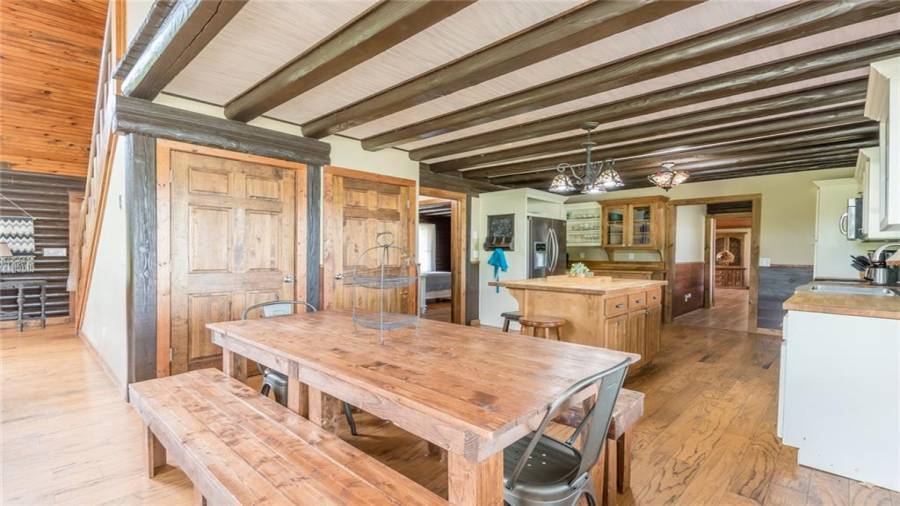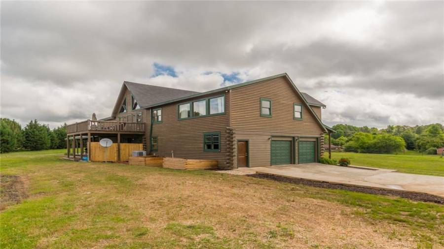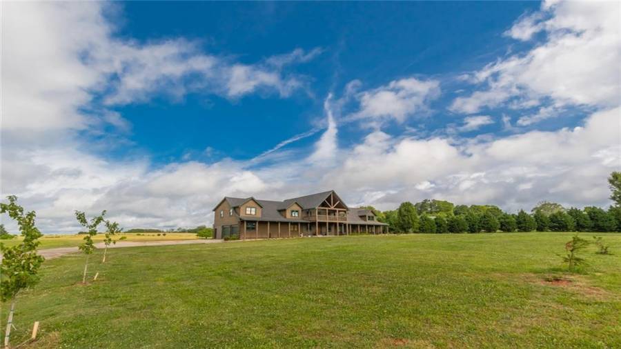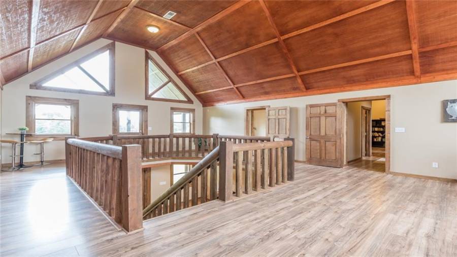 Indulge in gathering around a fire or relaxing in your jacuzzi under a blanket of stars. At the heart of this stunning log home is a beautiful country-chic kitchen with custom cabinets, stainless steel appliances, butcher’s block countertops, and a walk-in pantry. Enjoy gathering in the family room or the two-story great room, both with 20+ ft. ceilings and an abundance of natural light from the custom-made windows.