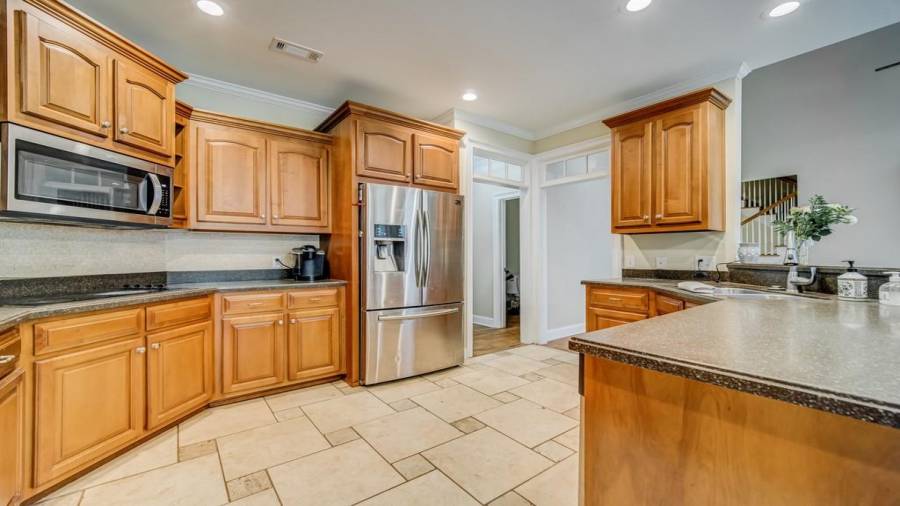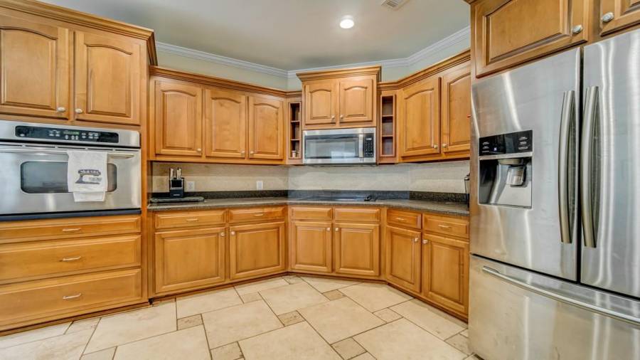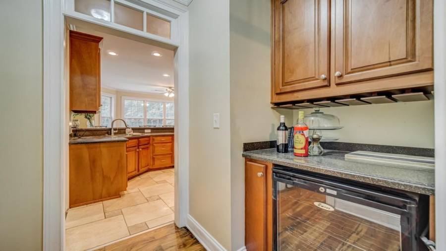 : Breakfast Bar, Cabinets Stain, Pantry Walk-in, View To Family Room, Stone Counters, Wine Rack