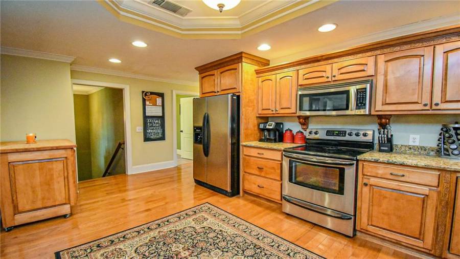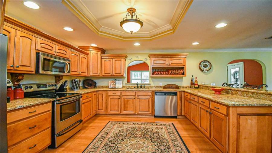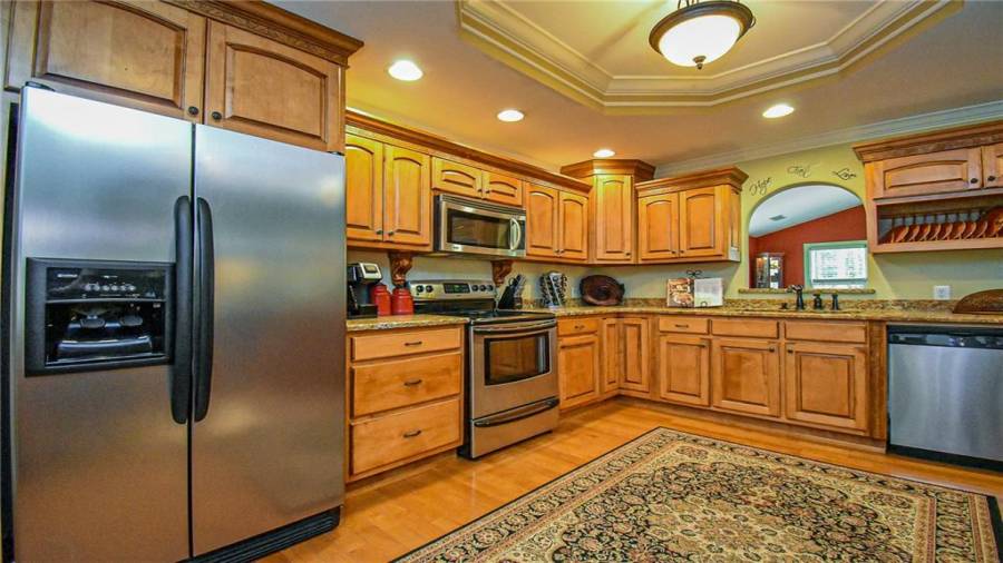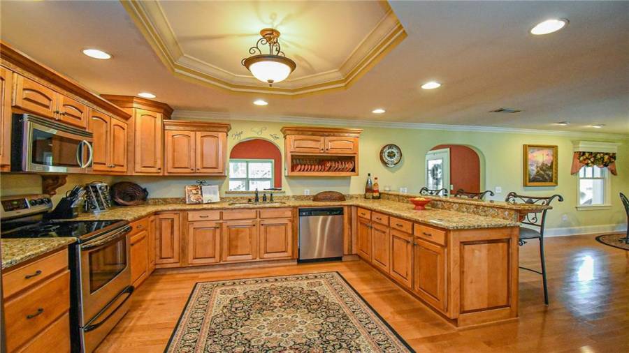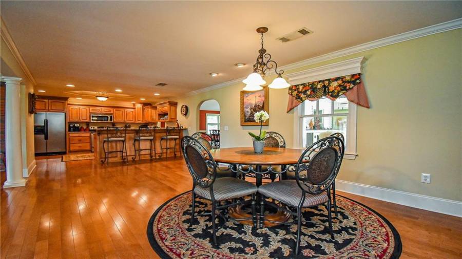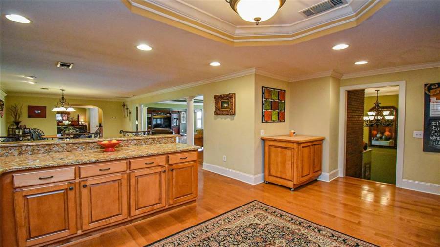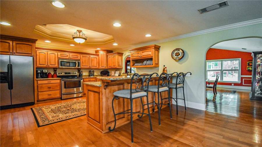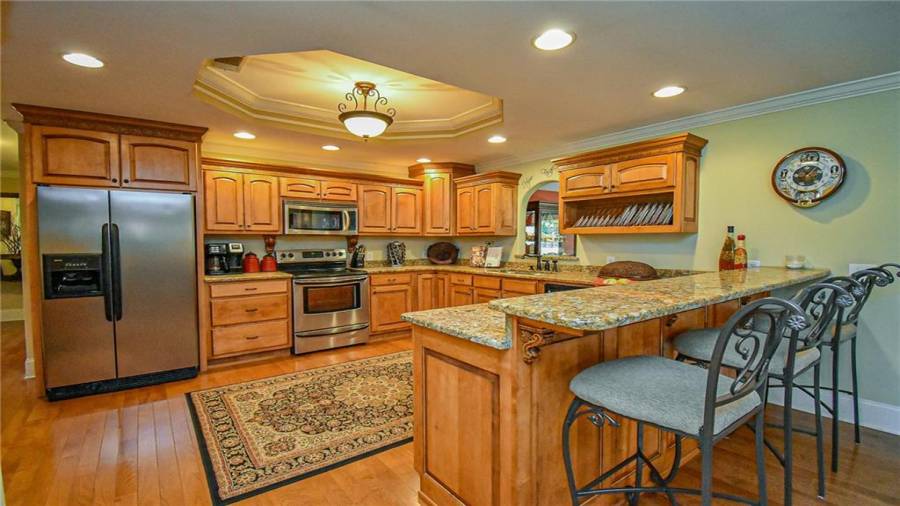 : Breakfast Bar, Cabinets Stain, Eat-in Kitchen, Breakfast Room, Country Kitchen, Pantry Walk-in, Kitchen Island, Pantry, View To Family Room, Solid Surface Counters
