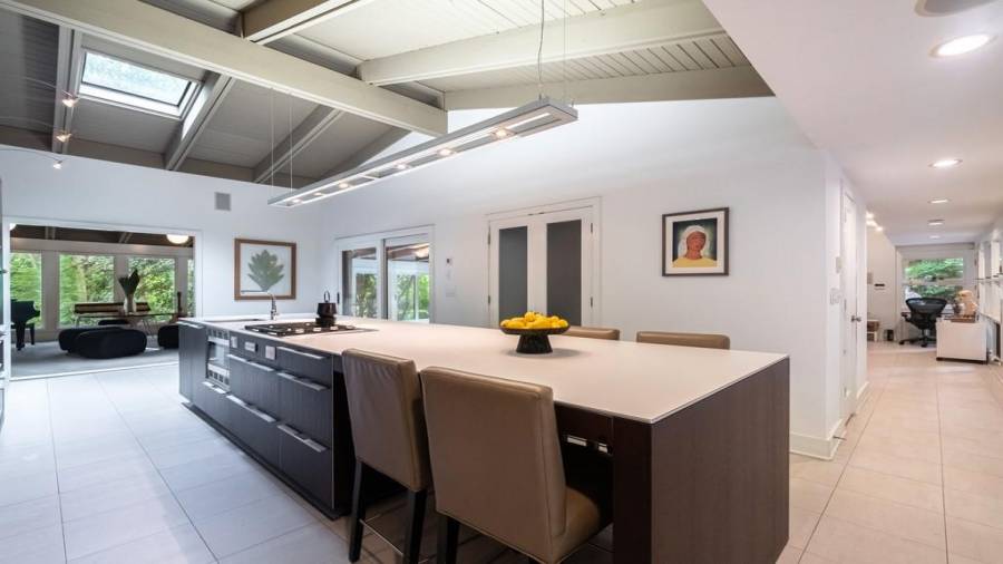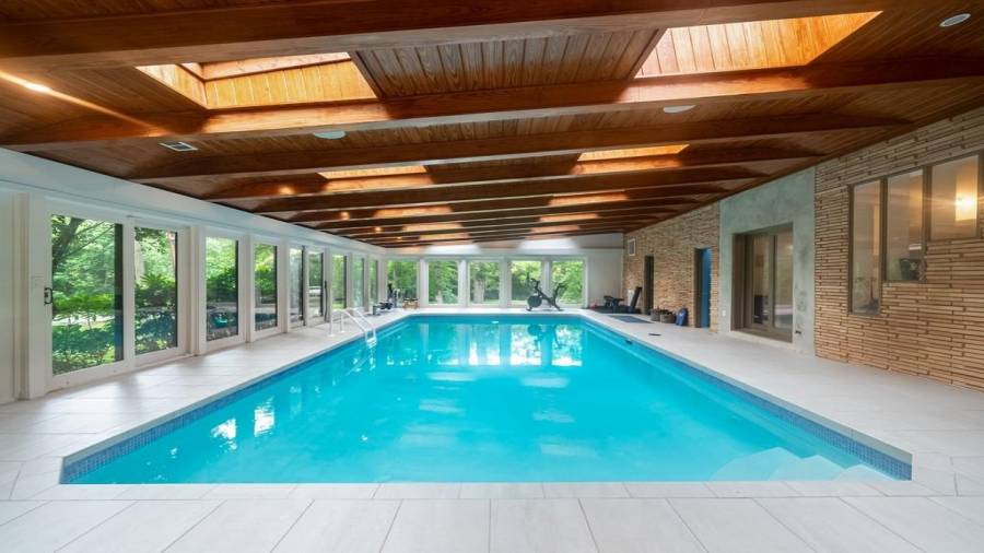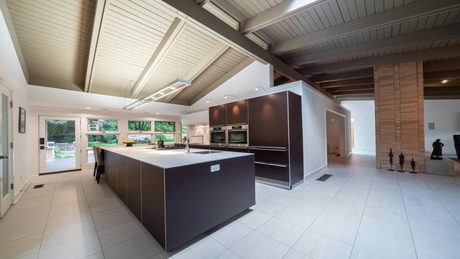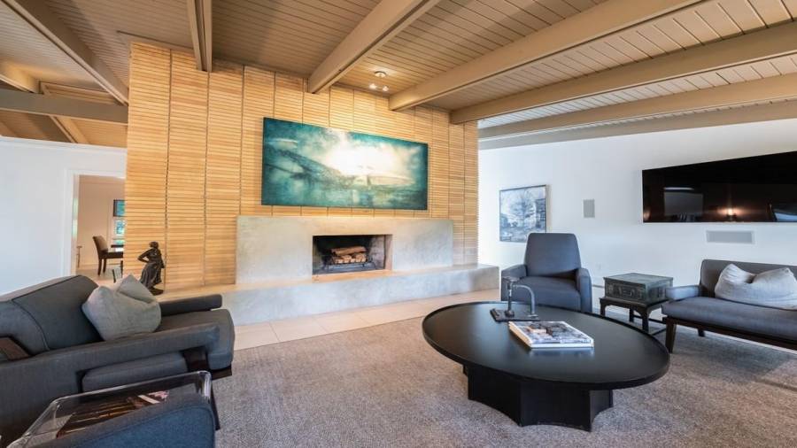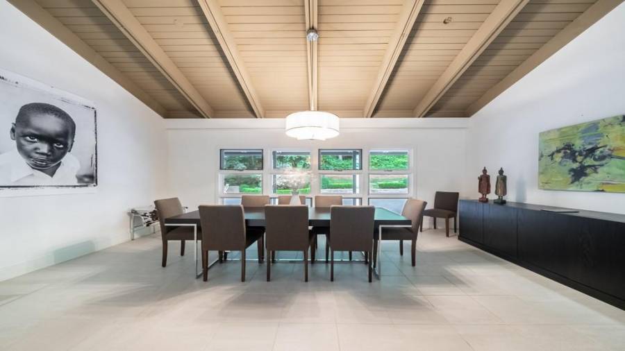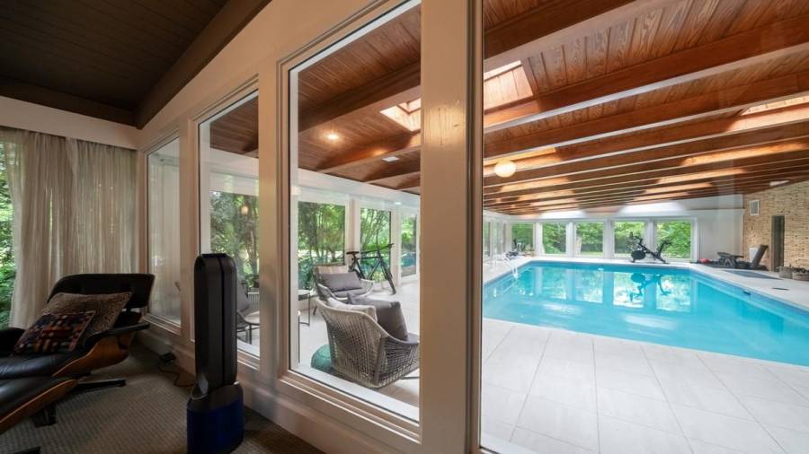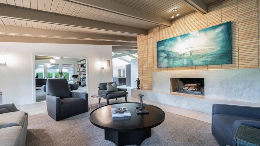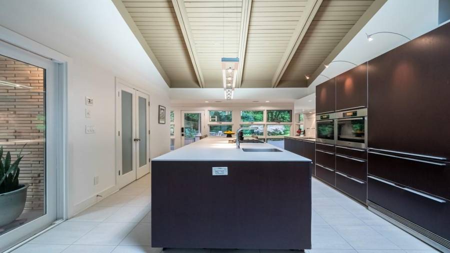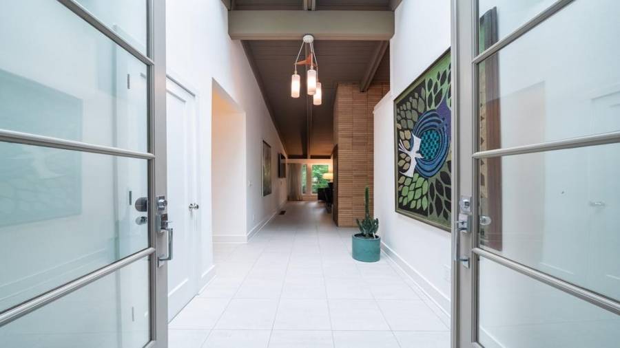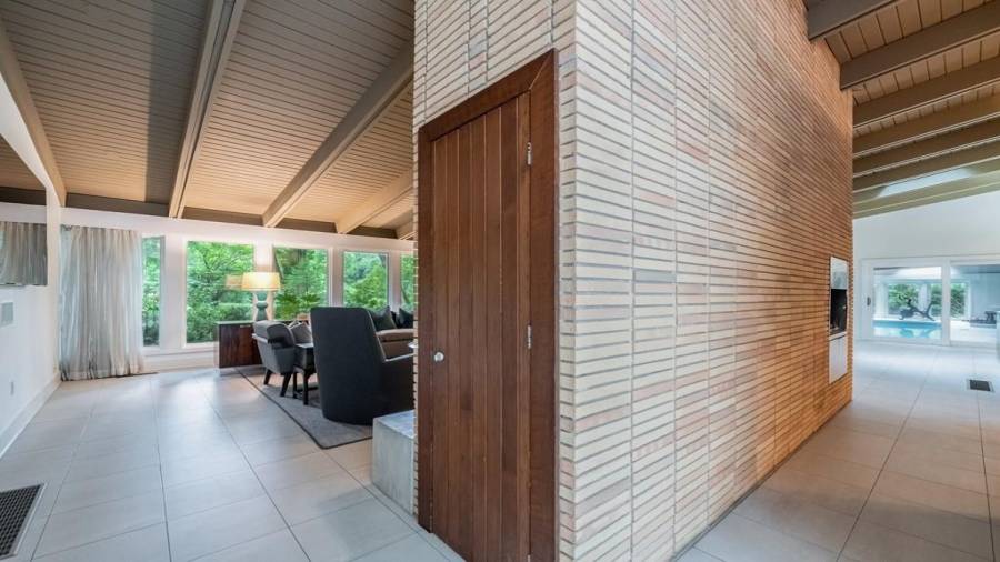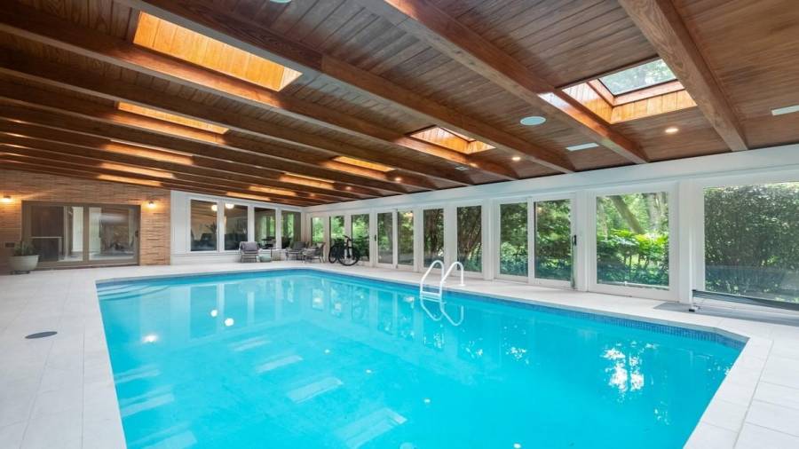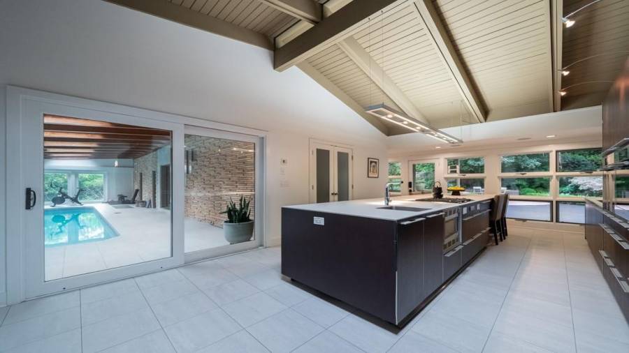 This stunning mid-century modern home was built in 1958 by the Nelkin family, well known architects at the time, who made it their residence into the mid 80’s. Completely renovated in 2005, this home was taken down to the studs and rebuilt, maintaining the architectural integrity while upgrading to current standards. The indoor pool roof was completely redesigned to include an additional 12 skylights, allowing the sky’s reflection to infuse the pool with a surreal light-sky-blue. Originally a 4 bedroom home, in the 2005 renovation, the Master Bath was expanded to