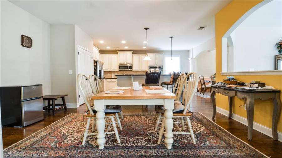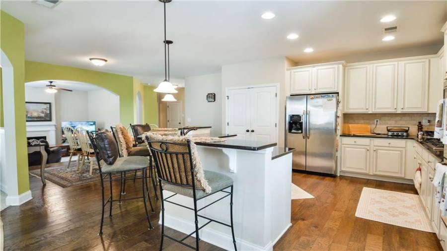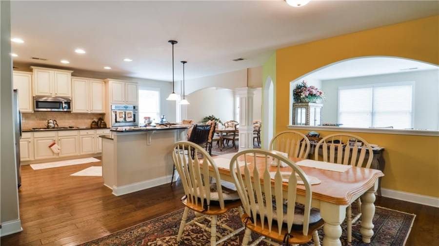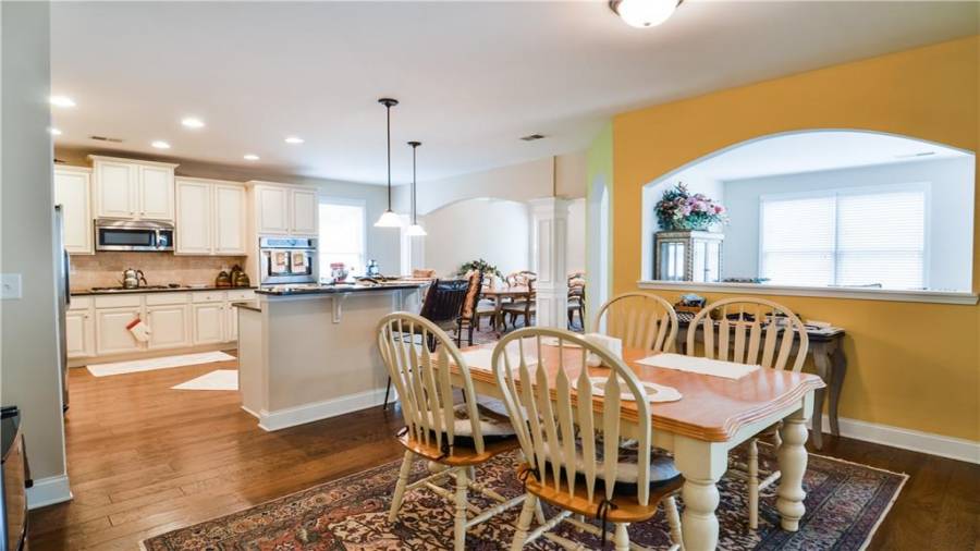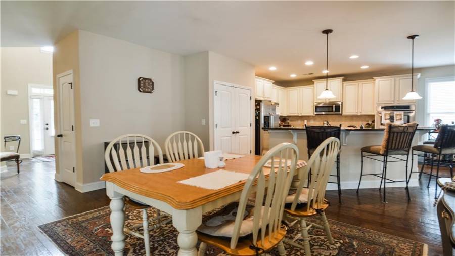 : Breakfast Room, Cabinets White, Kitchen Island, Pantry, View To Family Room, Solid Surface Counters