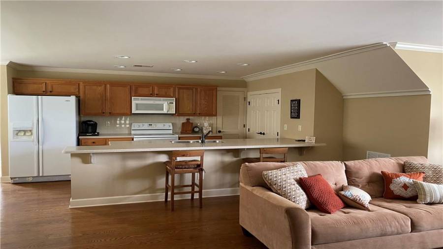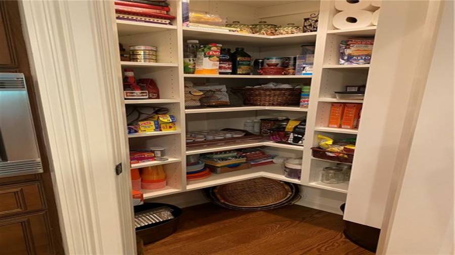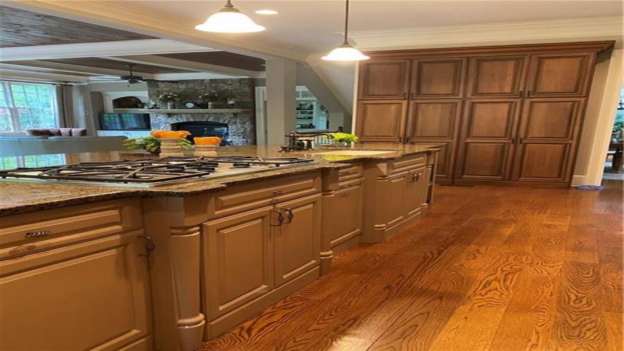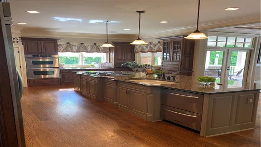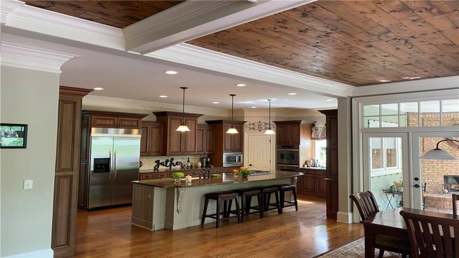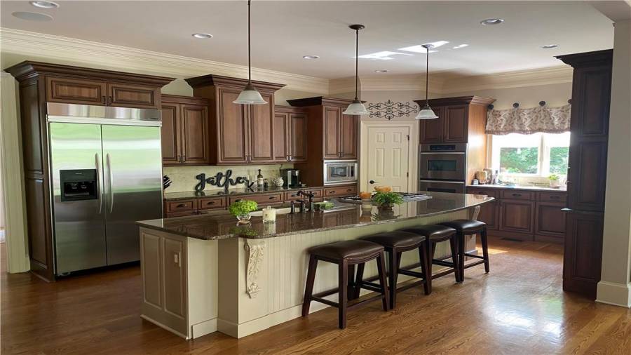 : Breakfast Bar, Cabinets Stain, Breakfast Room, Pantry Walk-in, Kitchen Island, Second Kitchen, View To Family Room, Solid Surface Counters