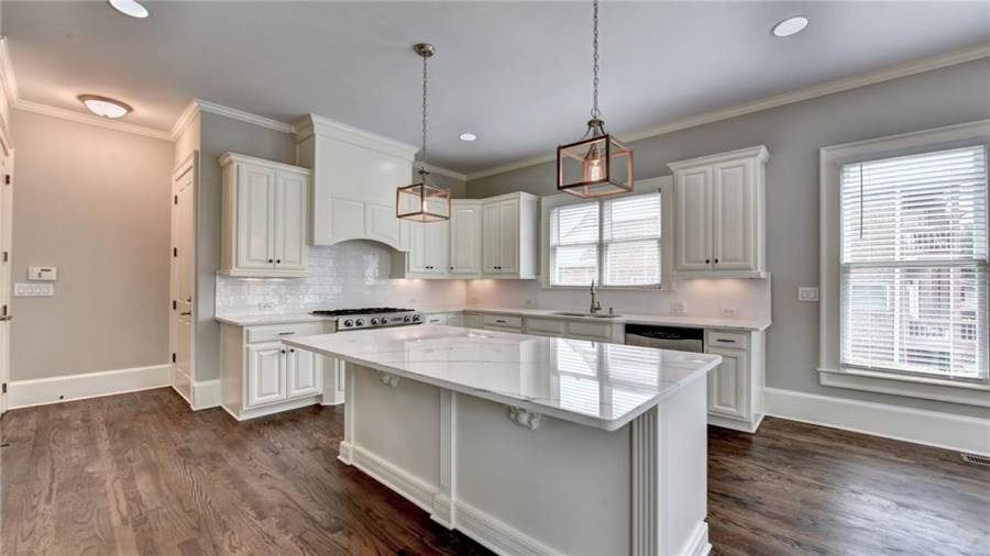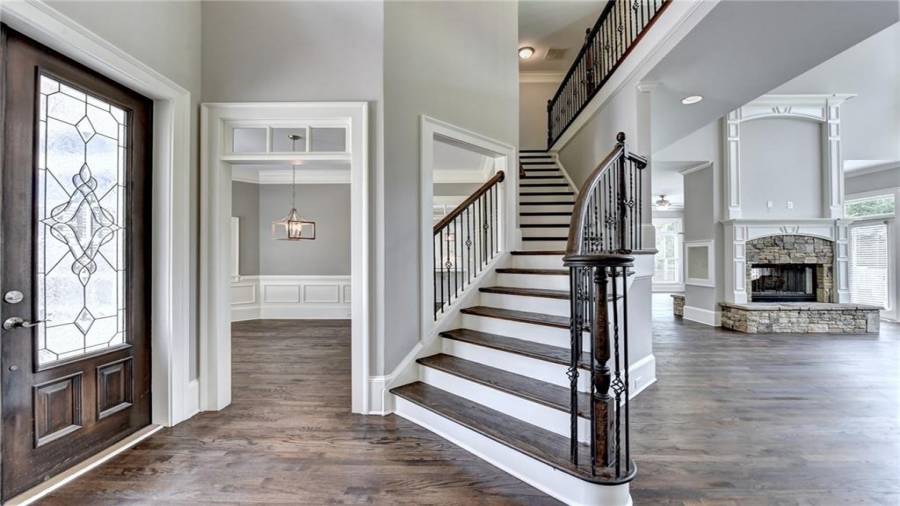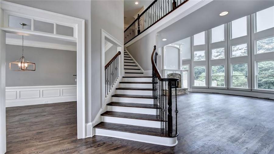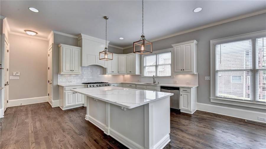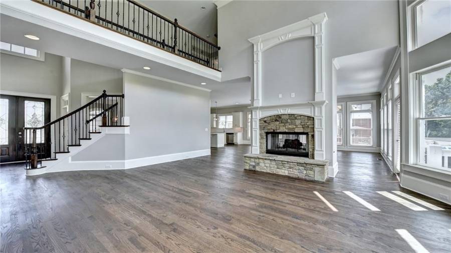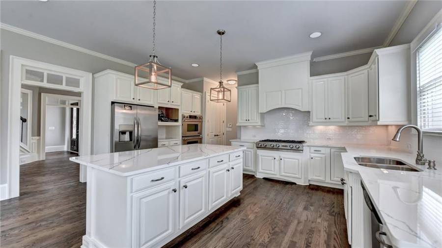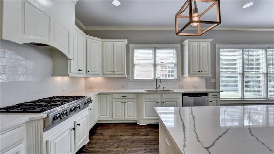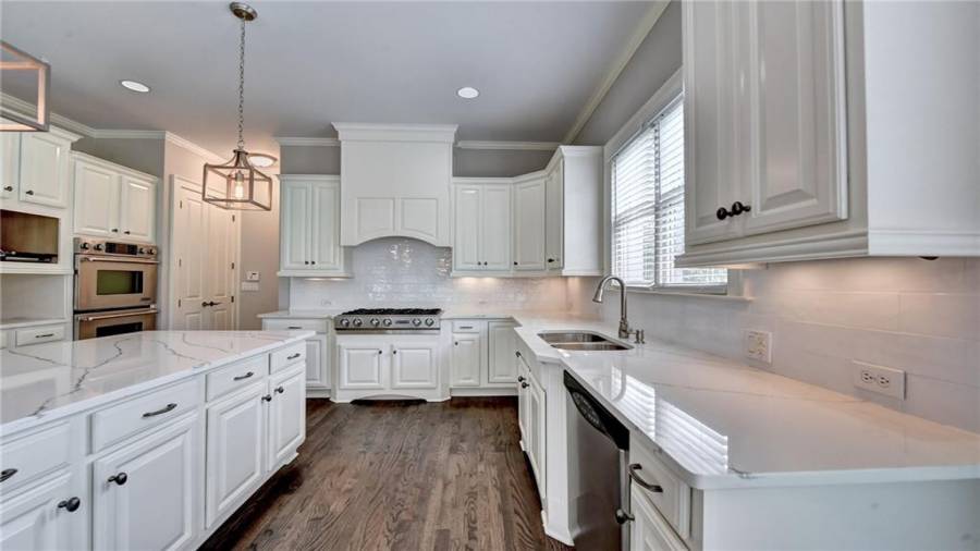 Stunning 6 bed/5.5 bath modern style, painted brick home with a professionally finished terrace level on a landscaped pool-ready lot! Refinished hardwood floors throughout the main & upstairs hallway! Enter through the double front doors to the 2 story foyer. Family-sized dining room w/bay window, crown & picture frame molding. Elegant office with crown molding. Grand 2-story family room with floor-to-ceiling windows, stone fireplace and new hardwood floor. Recently remodeled gourmet kitchen with quartz countertops, newly painted custom cabinetry, new backsplash,