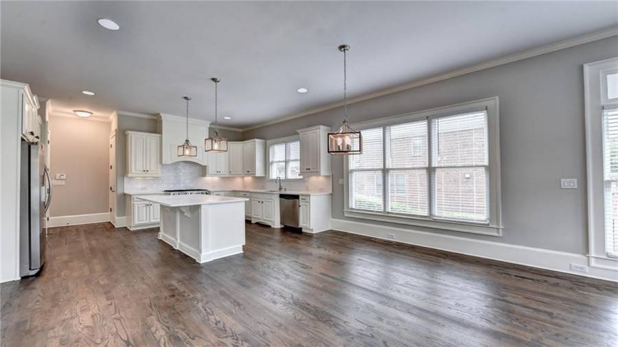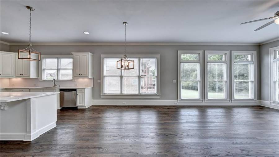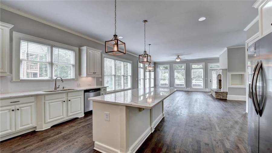 : Breakfast Bar, Breakfast Room, Cabinets White, Pantry Walk-in, Keeping Room, Kitchen Island, View To Family Room, Stone Counters