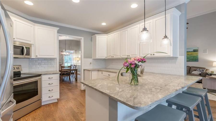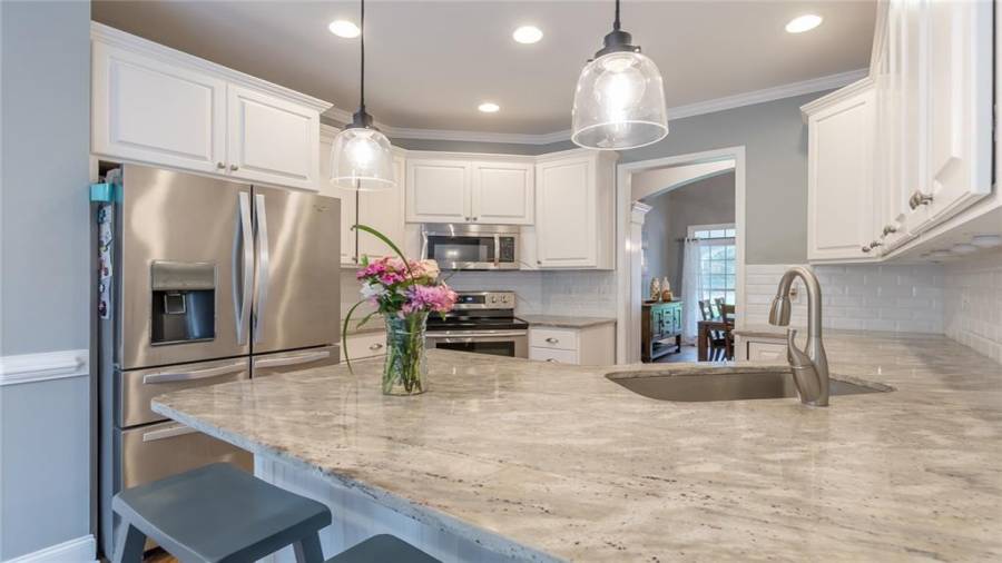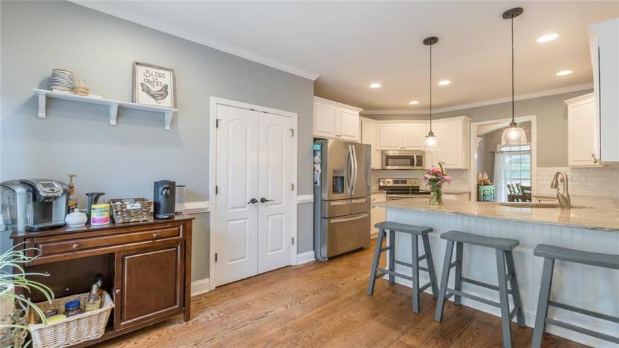 : Breakfast Bar, Eat-in Kitchen, Cabinets White, Pantry, Second Kitchen, Stone Counters