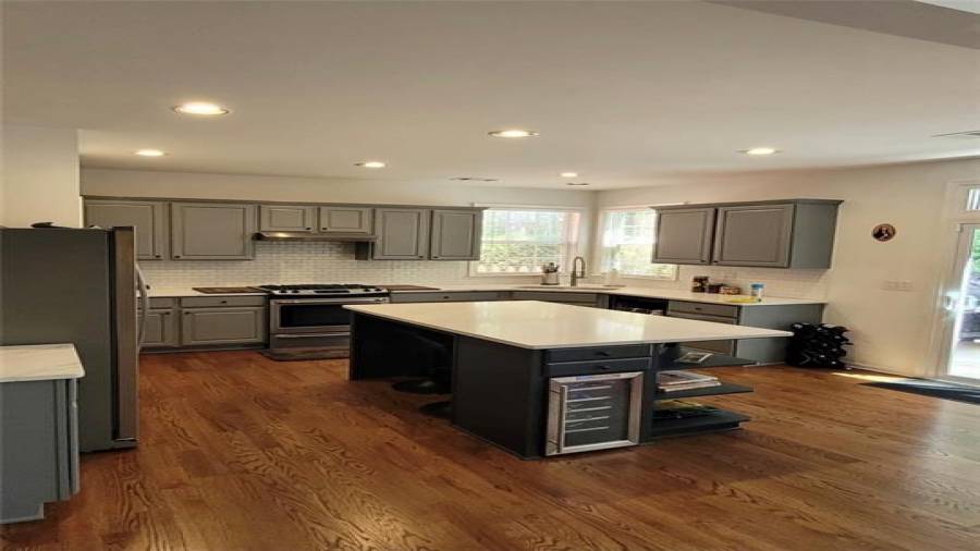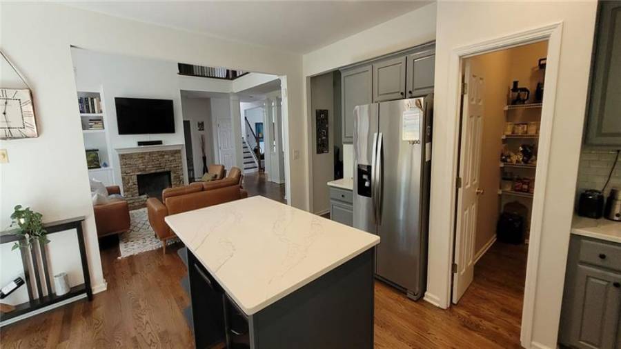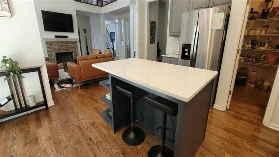 : Cabinets Stain, Eat-in Kitchen, Pantry Walk-in, Kitchen Island, View To Family Room, Stone Counters