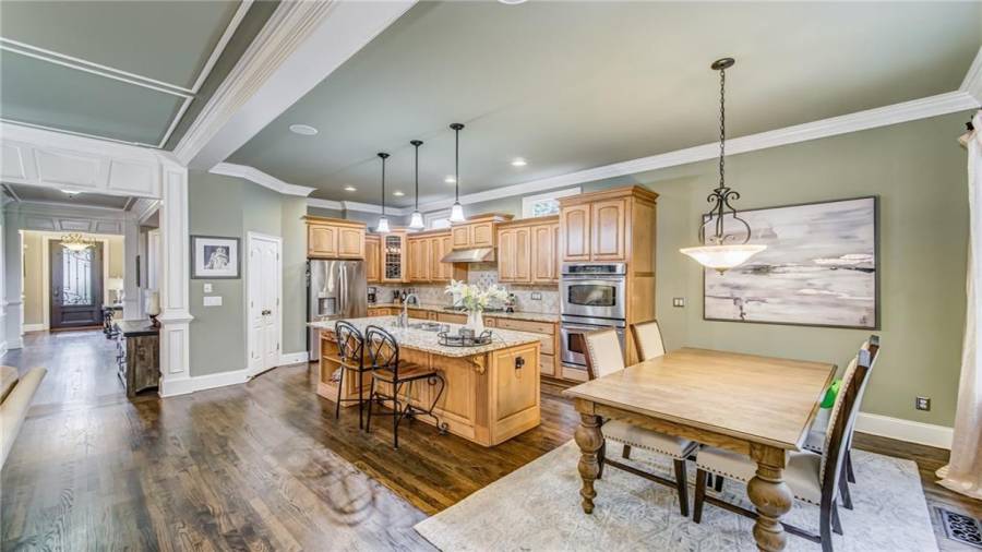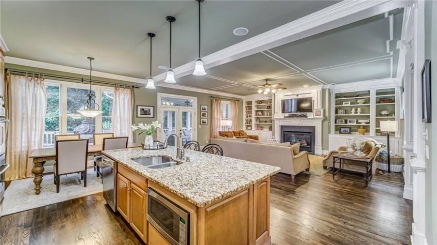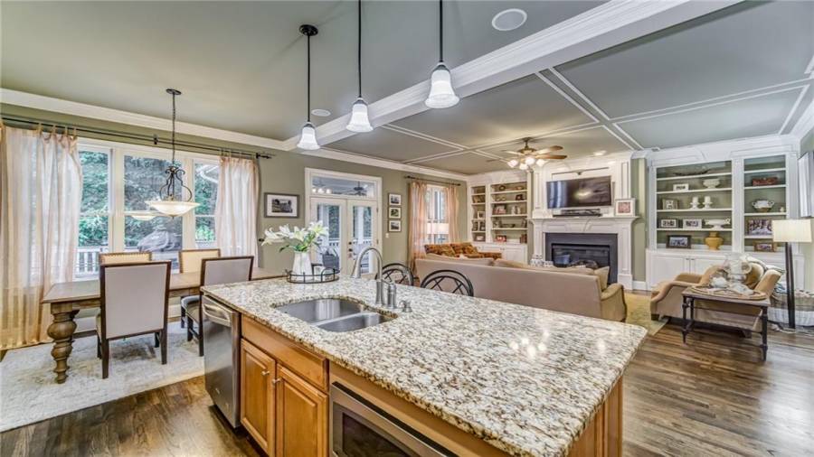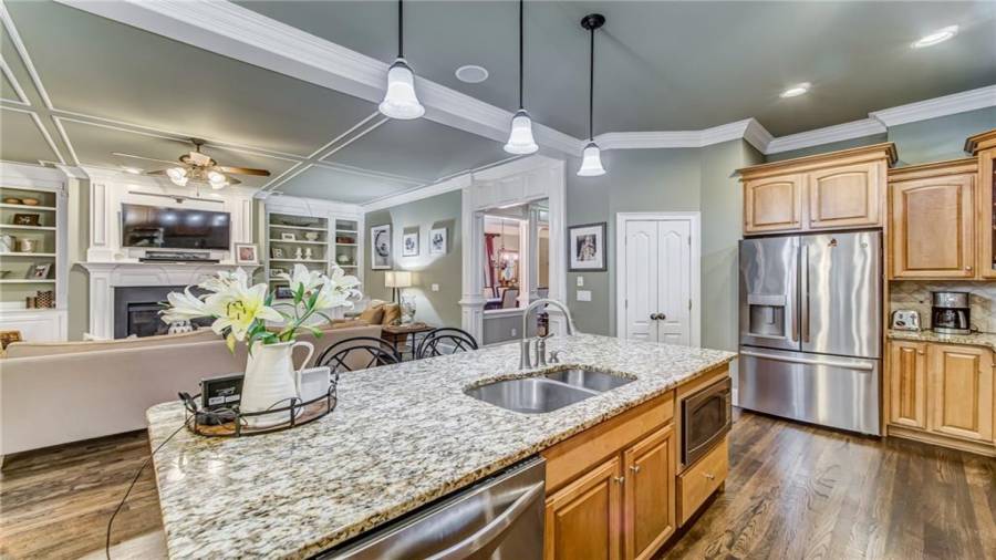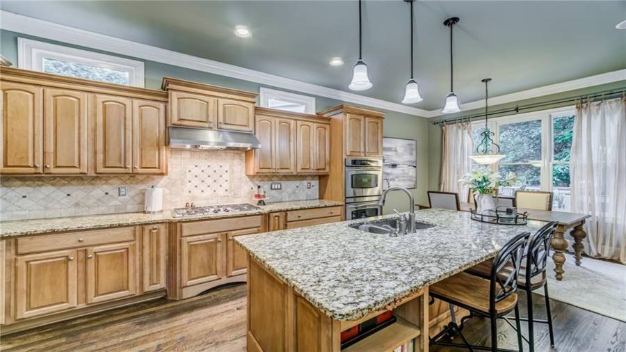 : Cabinets Stain, Eat-in Kitchen, Kitchen Island, Pantry, View To Family Room, Stone Counters