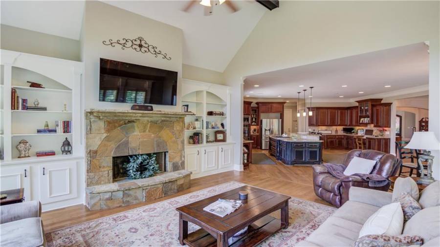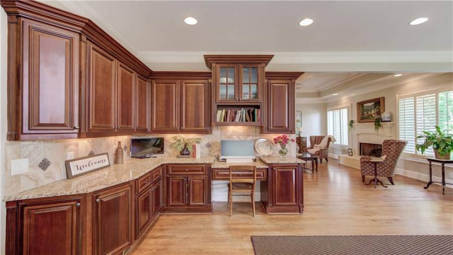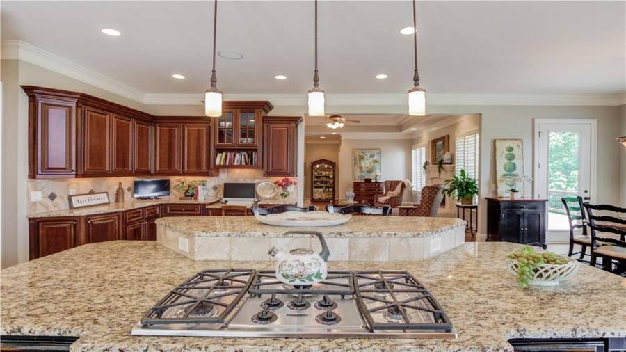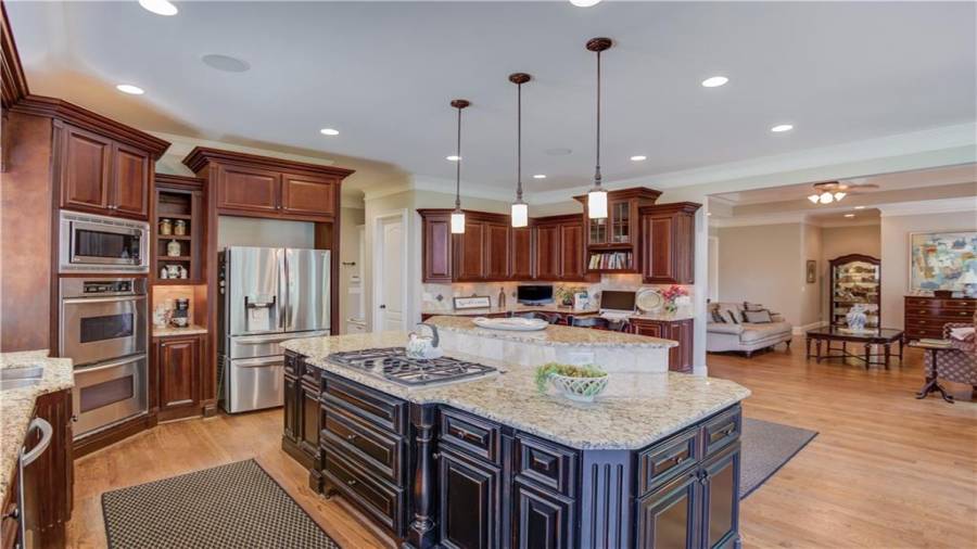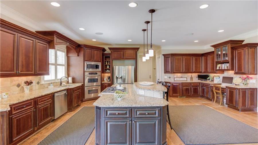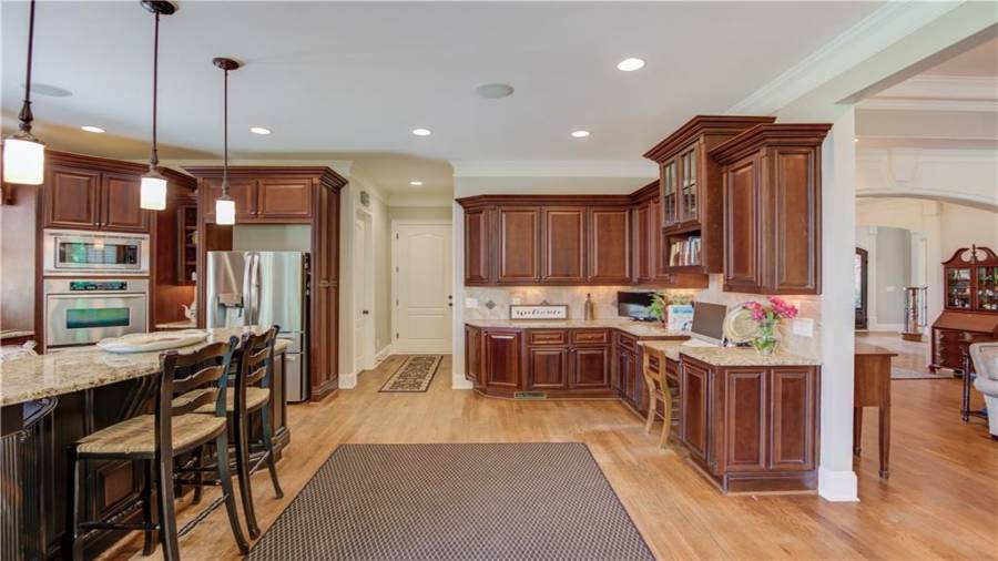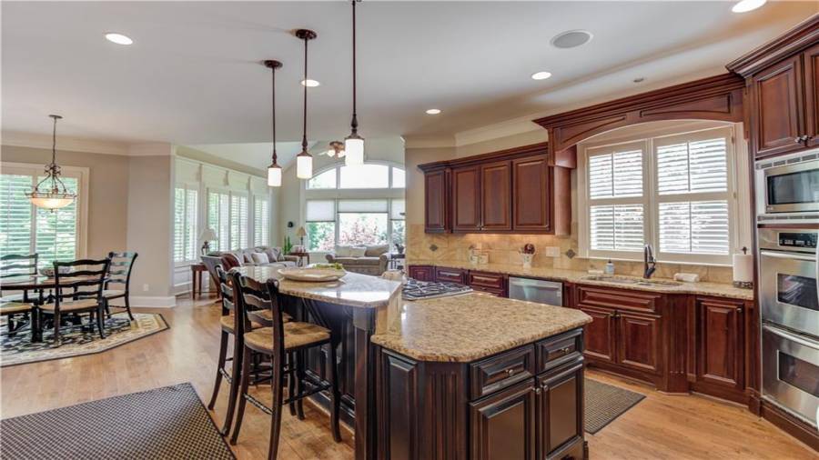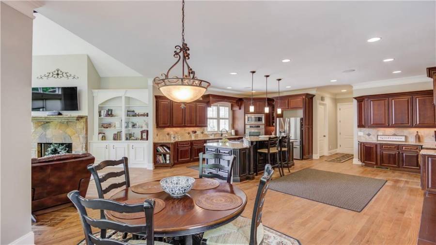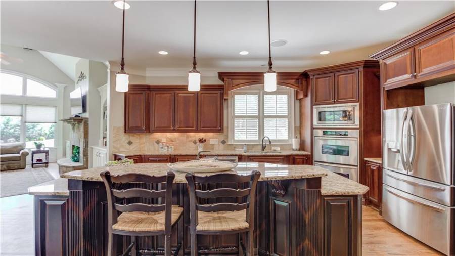 : Breakfast Bar, Cabinets Stain, Eat-in Kitchen, Breakfast Room, Pantry Walk-in, Keeping Room, Kitchen Island, View To Family Room, Stone Counters
