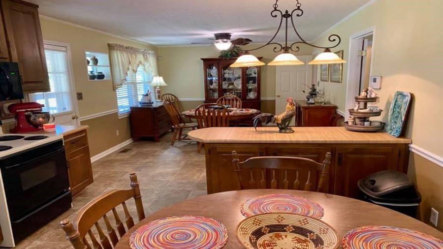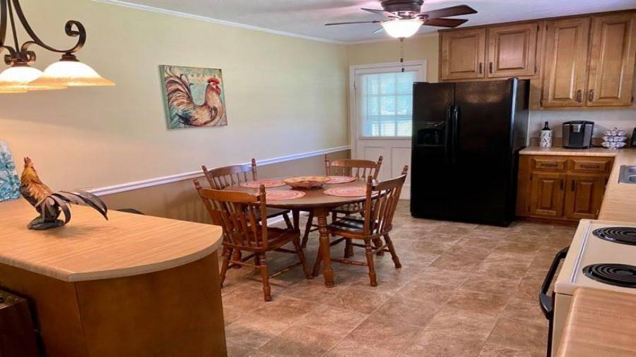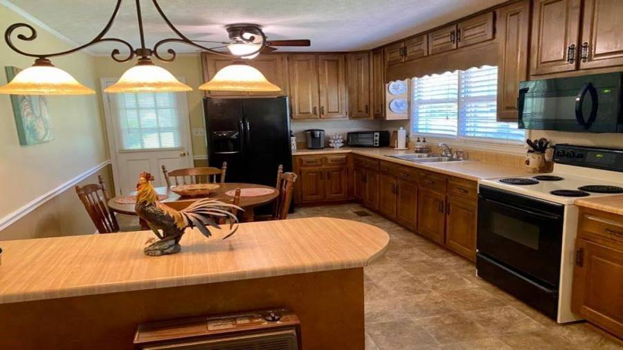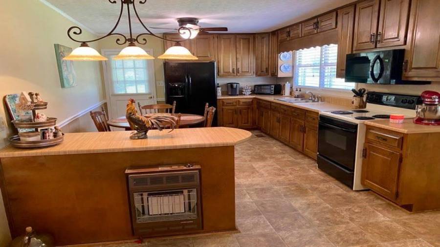 : Breakfast Bar, Cabinets Stain, Laminate Counters, Eat-in Kitchen, Country Kitchen