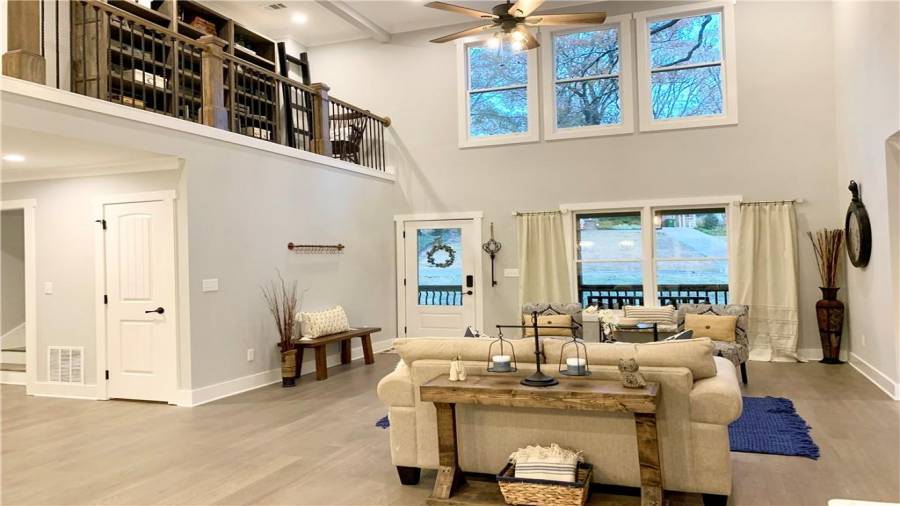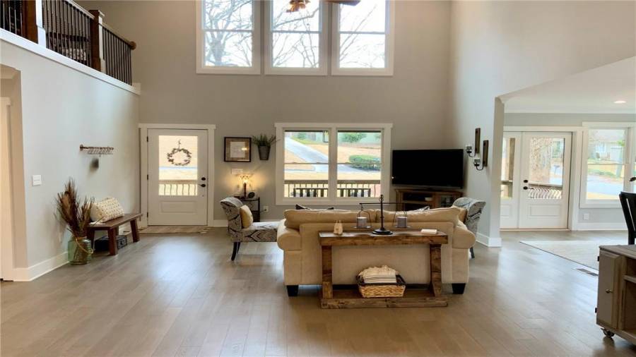 : Breakfast Bar, Cabinets White, Keeping Room, Kitchen Island, Pantry, View To Family Room, Stone Counters