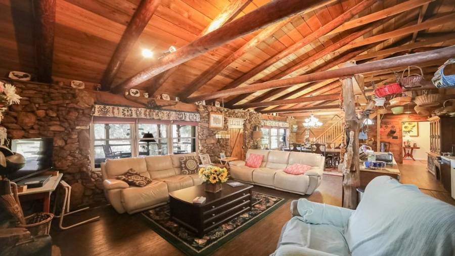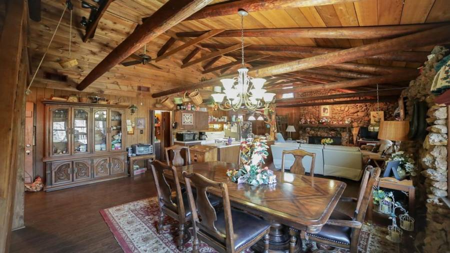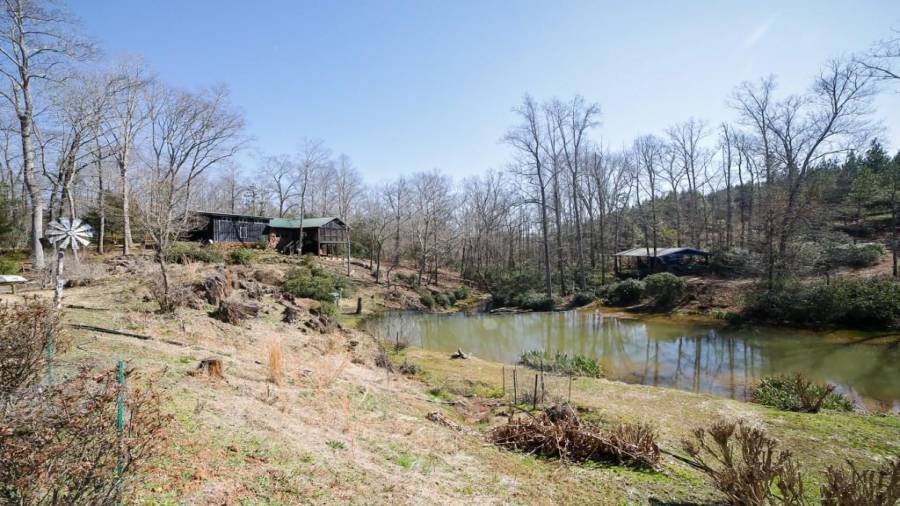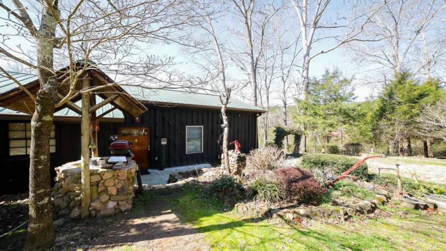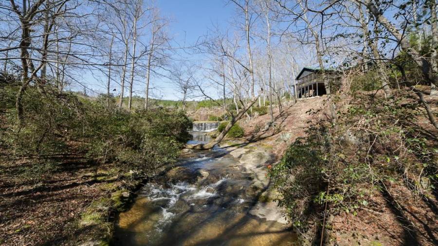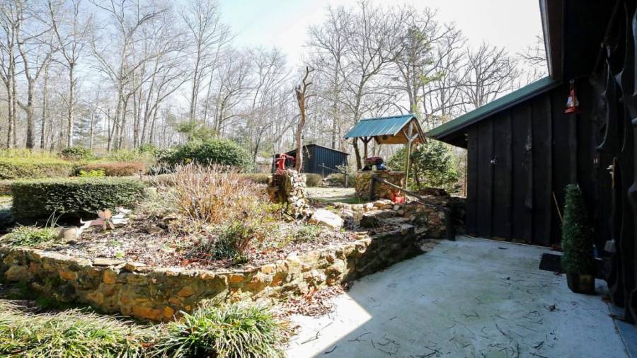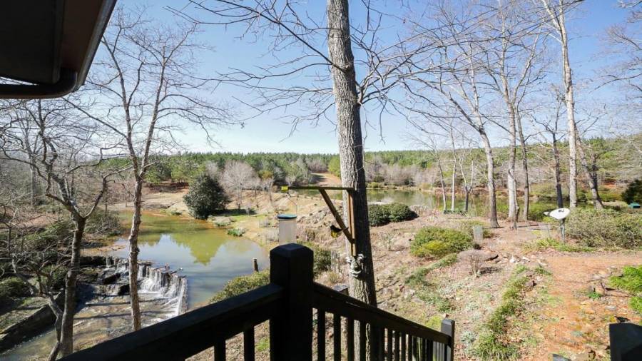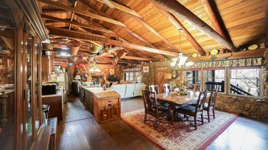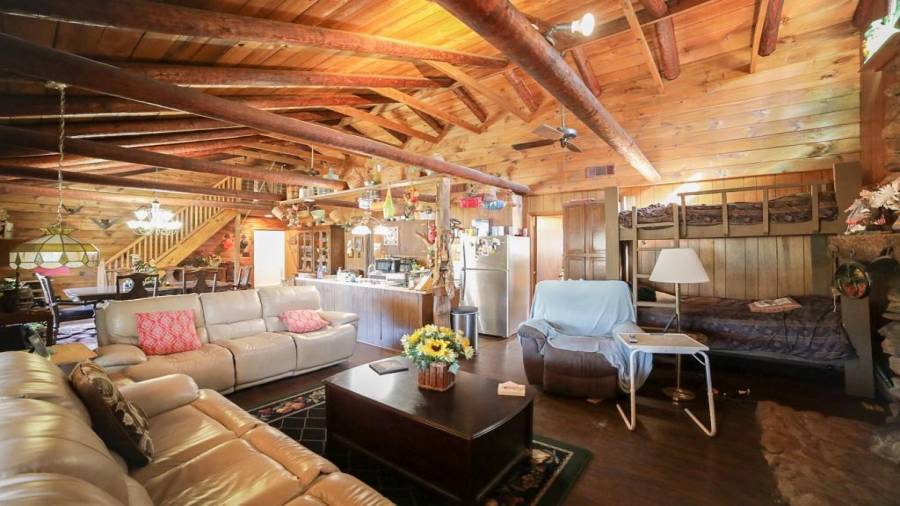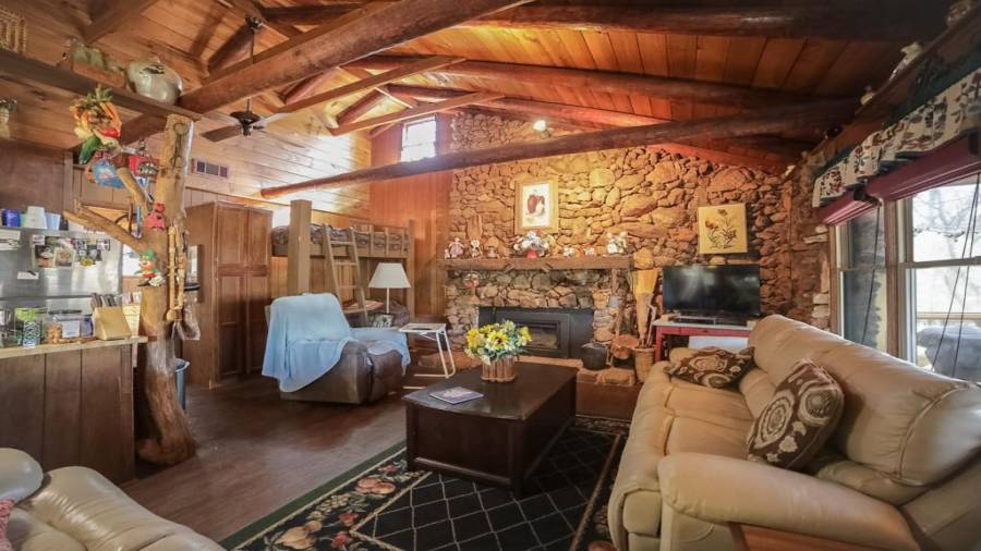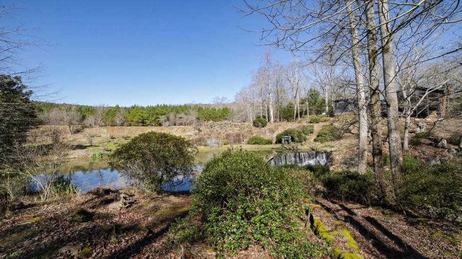 Approaching this 62 acre tract, you are received by the front gate guiding you in. As you travel along, notice the barn, RV pole shed, & park signs. Then you get a glimmer of the sparkling lake & cabin. As you approach the cabin you can hear the rushing of the waterfall. Yes, this property comes with a waterfall! Prior to entering, notice the detached garage/workshop, storage shed & old stone well. Custom built in 1970 & updated with an additional 2 beds & 2nd floor bonus/play room. Wood doors accented with antique hardware, beamed vaulted ceilings, exposed rock wall