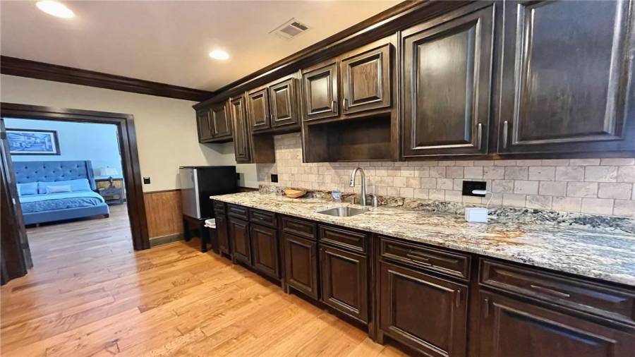 : Cabinets Stain, Eat-in Kitchen, Kitchen Island, Solid Surface Counters, Wine Rack