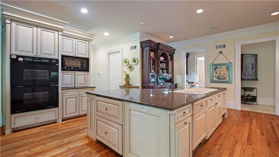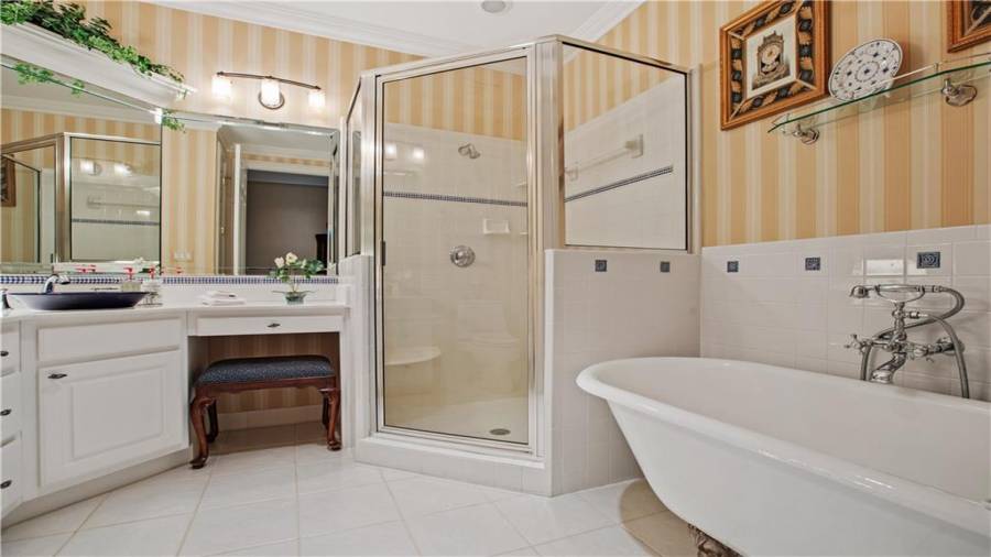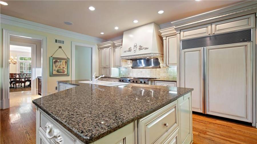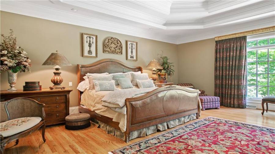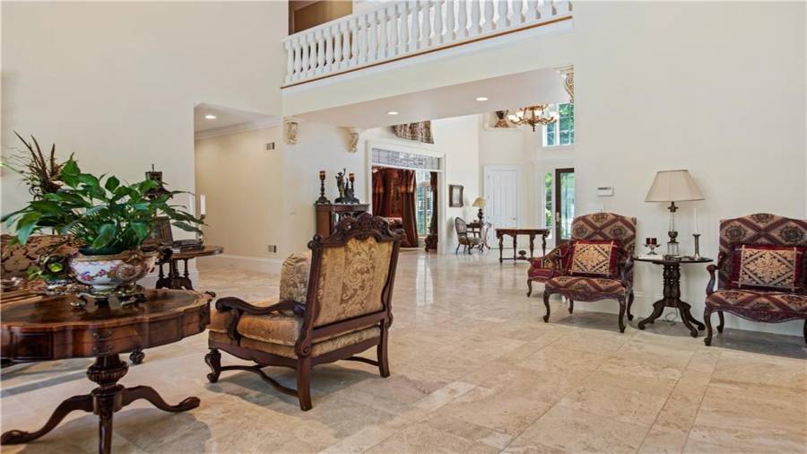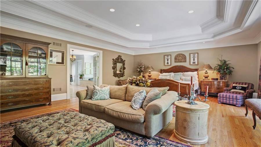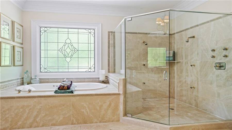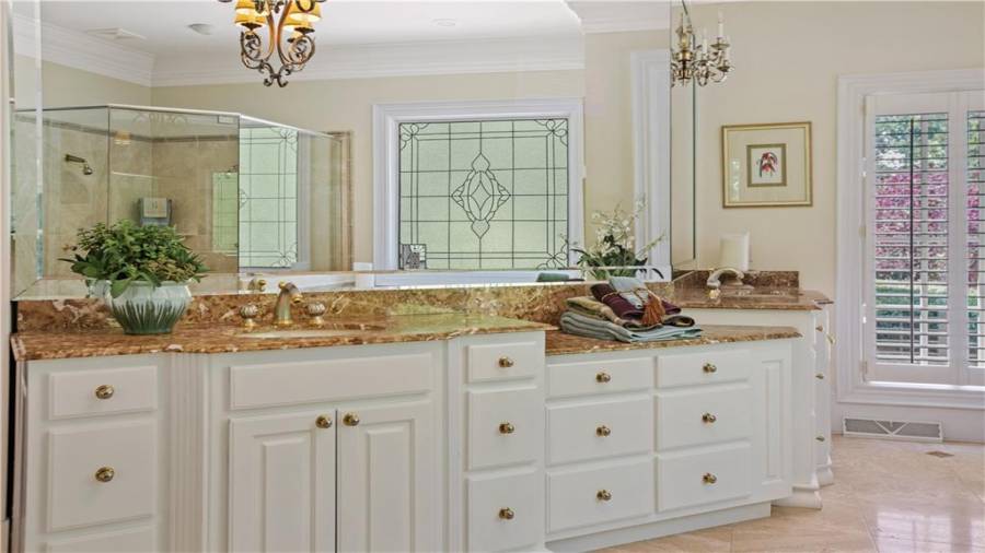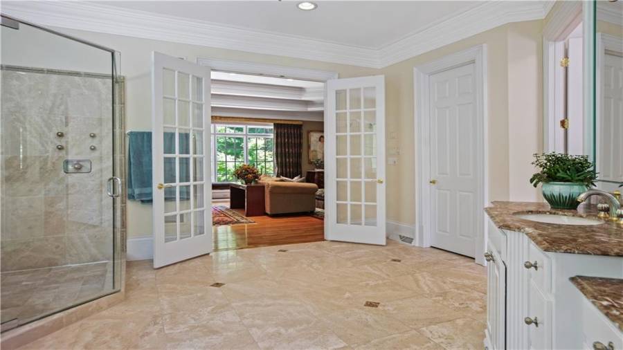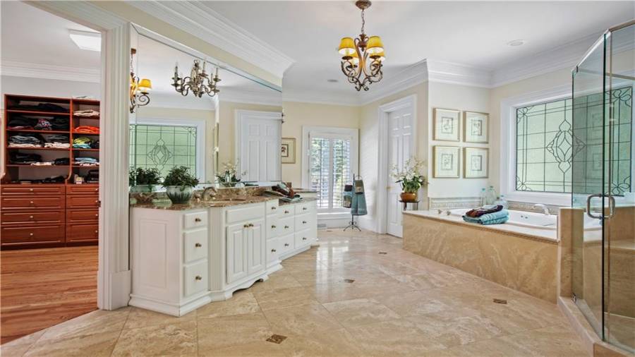 A private oasis perfect for quarantine! Double gated driveway. 12′ ceilings on main. 4 car garage on main. Exquisite owner’s suite located on main level. Includes enormous master closet with glam area. Oversized master bedroom has a sitting area, fireplace, built in bookshelves, and vaulted ceilings. Inviting French doors open into the luxurious master bathroom. Master bathroom has limestone flooring throughout and includes two water closets, two vanities with granite countertops, two person shower with six multi-level shower heads, 6′ Kohler two person jetted tub.