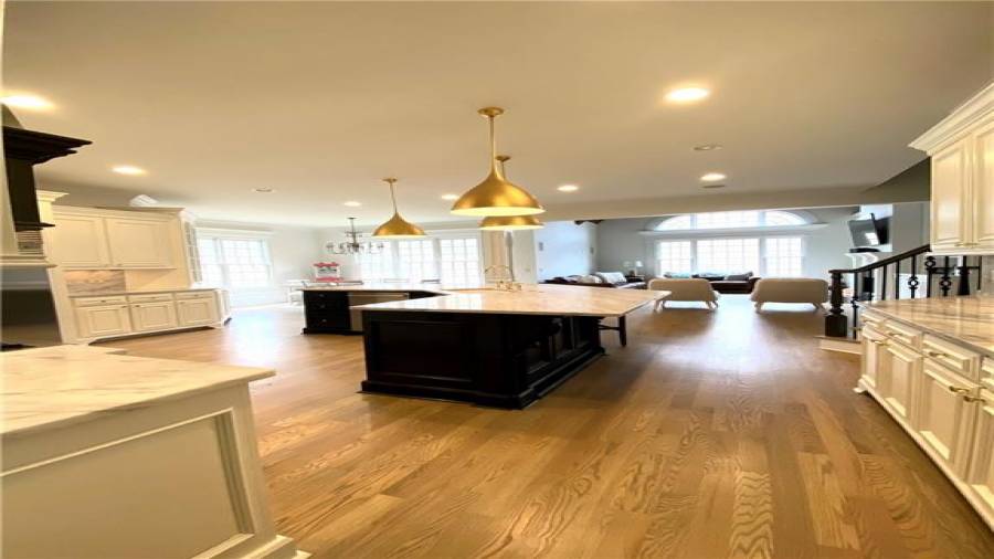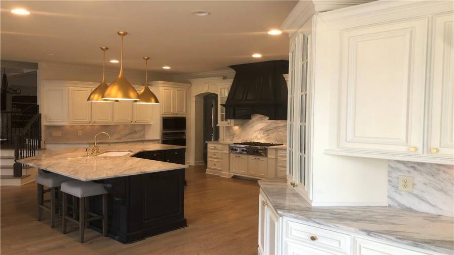 : Breakfast Bar, Breakfast Room, Cabinets White, Pantry Walk-in, Kitchen Island, View To Family Room, Stone Counters, Cabinets Other